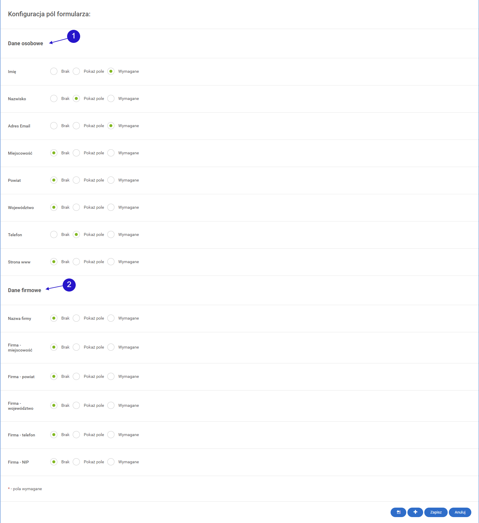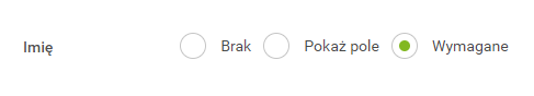 Pola z danymi osobowymi. Użytkownik ma możliowść wyboru, jakie pole będzie w formularzu kontaktowym. Istnieją trzy możliwości dla każdego pola: