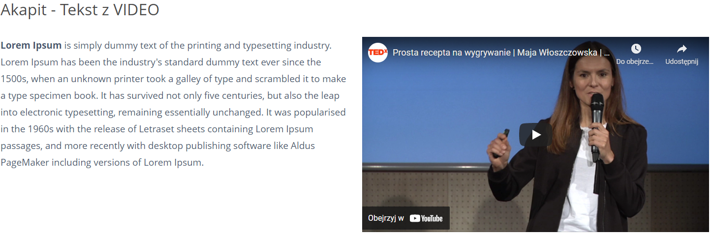 Układ, w którym treść znajduję się w kolumnie po lewej, zaś po prawej stronie wyświetlane jest wideo.