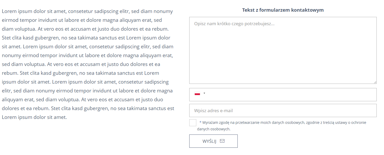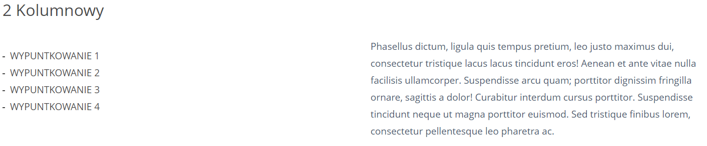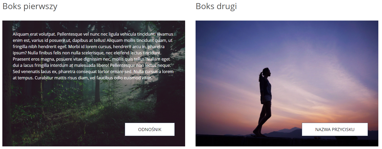 Układ wyświetlany w dwóch kolumnach nad każdą znajduje się wprowadzony tytuł, pod tytułem treść. W tle tekstu możemy ustawić zdjęcie. Na dole po prawej stronie wyświetlany jest przycisk (jeżeli chcemy) przenoszący do ustawionego adresu URL (strony internetowej).