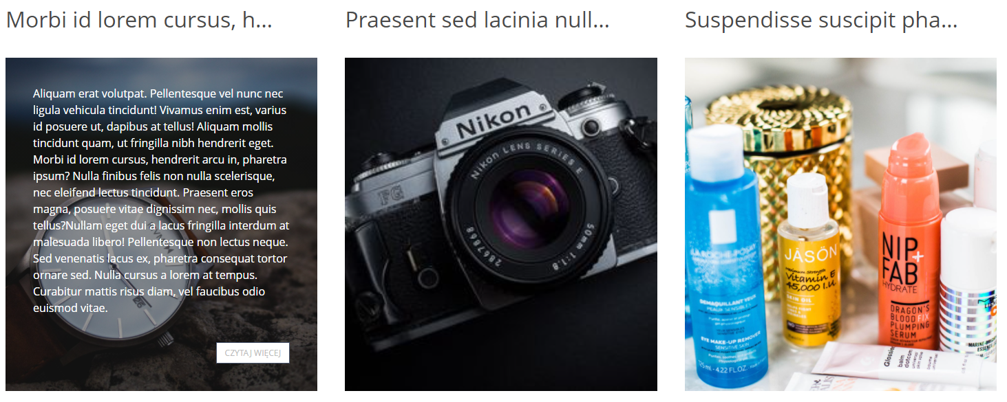 Układ wyświetlany w trzech kolumnach nad każdą znajduje się wprowadzony tytuł, pod tytułem treść. W tle tekstu możemy ustawić zdjęcie. Na dole po prawej stronie wyświetlany jest przycisk (jeżeli chcemy) przenoszący do ustawionego adresu URL (strony internetowej).