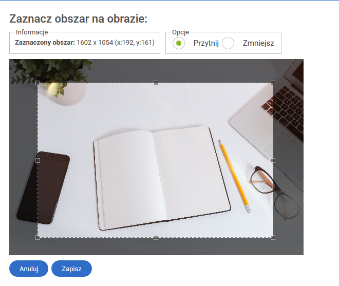 Na panelu należy wybrać obszar, który pozostanie jako obraz naszego zdjęcia za pomocą rozjaśnionego pola oraz dostępnych punktów transformacji. Modyfikację kończymy klikając Zapisz.