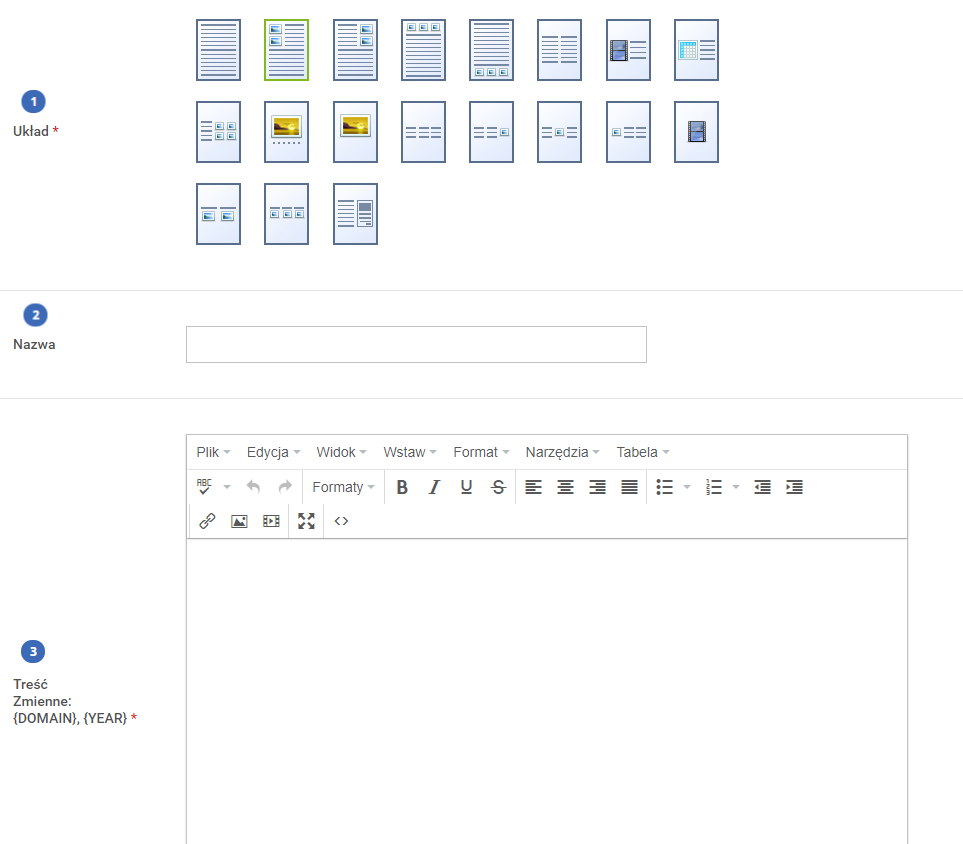 Treść - pole do wprowadzania wyświetlanej treści (podczas wklejania treści z edytora np. Word zalecane jest wklejanie treści bez formatowania w celu utrzymania jak najlepszej estetyki prowadzonej strony)