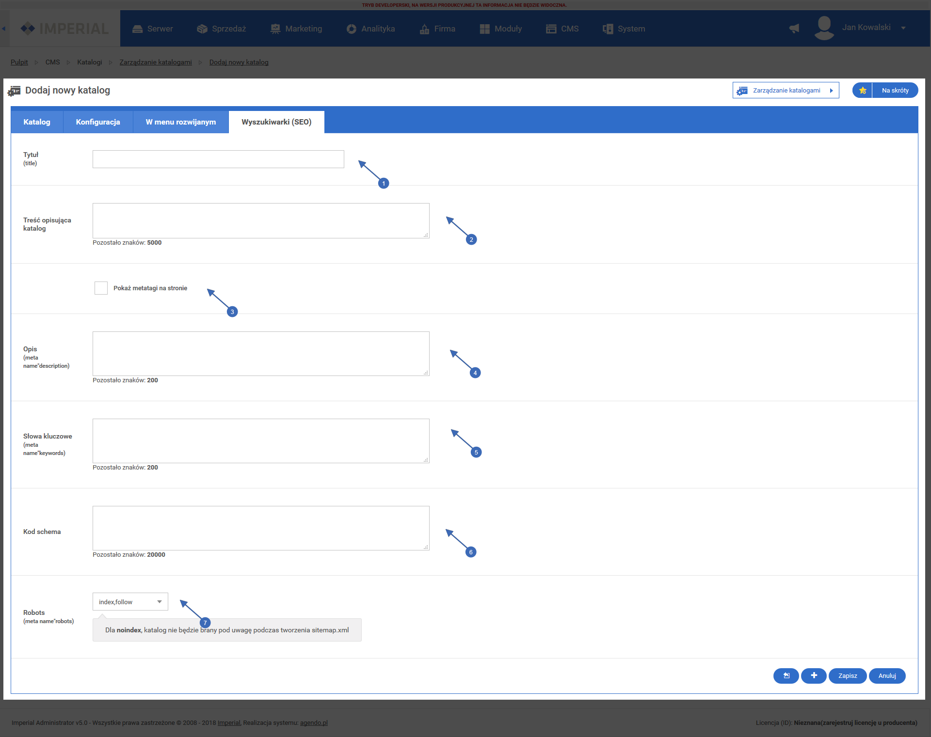 Dostępne opcje pozwalają na skonfigurowanie katalogu pod kątem wyszukiwarek