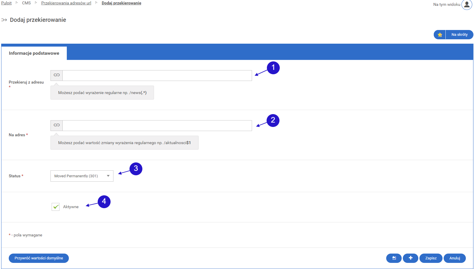 • 1.2. Tworzenie nowego przekierowania adresu url