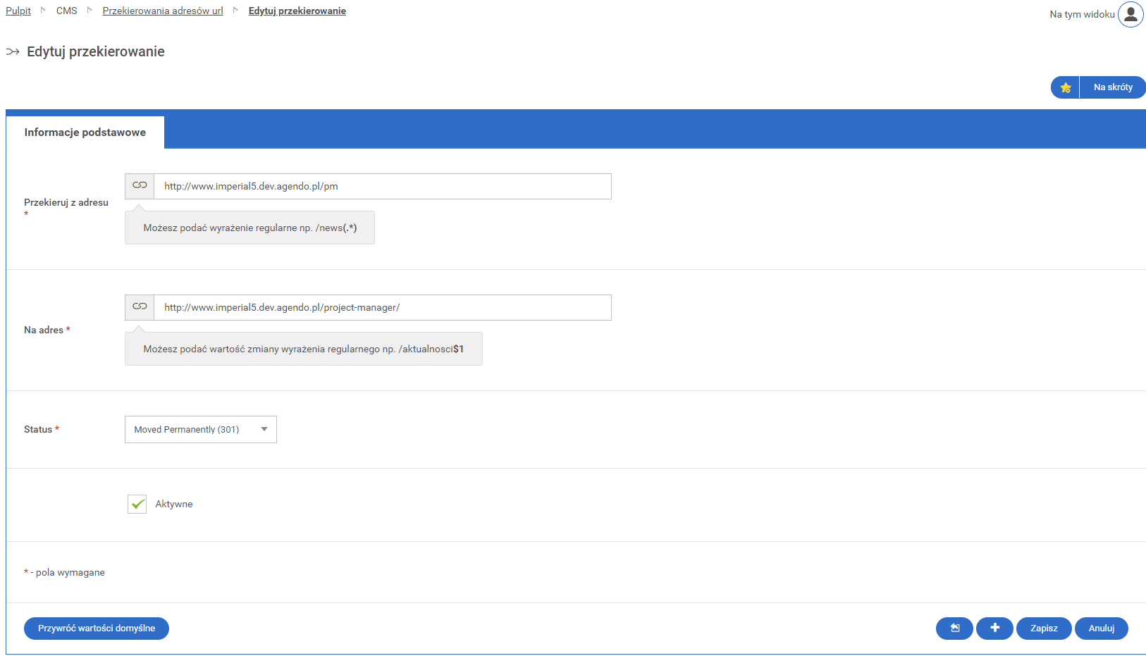 • 1.3. Ekran edycji istniejącego przekierowania adresów url.