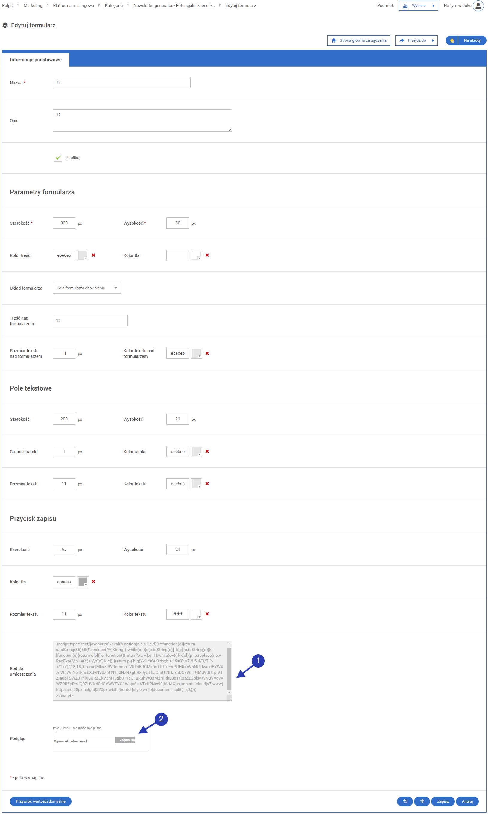 Pole z podglądem formularza zapisu do newslettera. Dostępne dopiero po zapisie formularza.