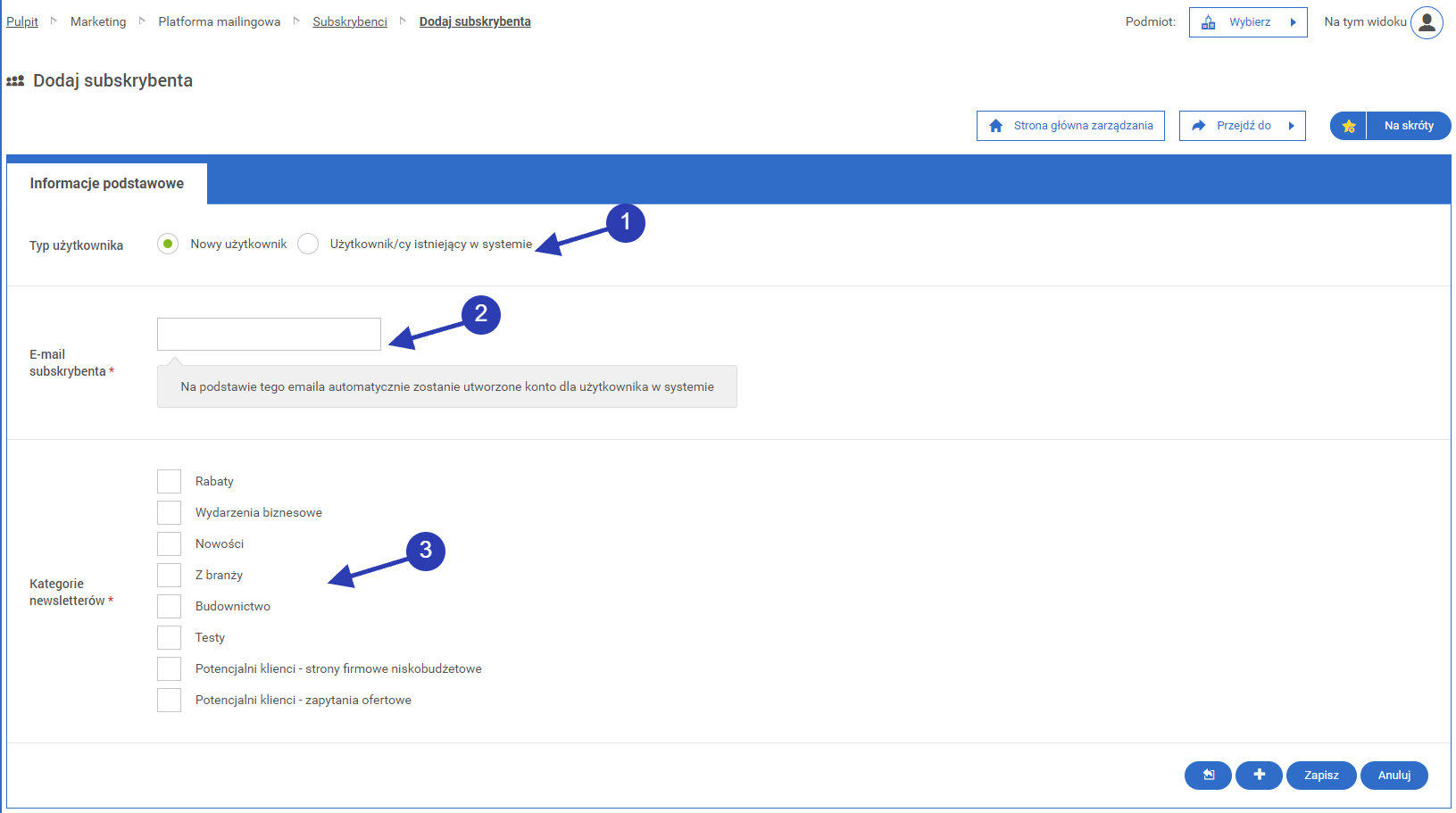 Określenie typu użytkownika jako nowy (domyślnie zaznaczone przy dodawaniu subskrybenta) lub użytkownika istniejącego w systemie.