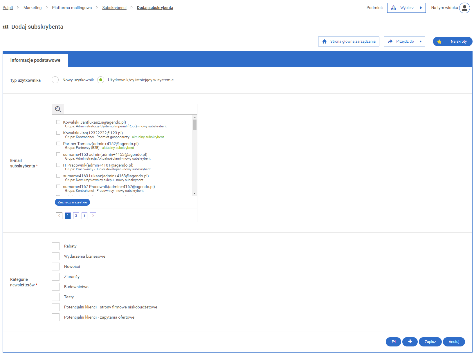 W przypadku dodawania nowego użytkownika/użytkowników jako już istniejącego/istniejących w systemie pojawia się na ekranie lista z adresami e-mail, gdzie można wybrać subskrybenta/subskrybentów.