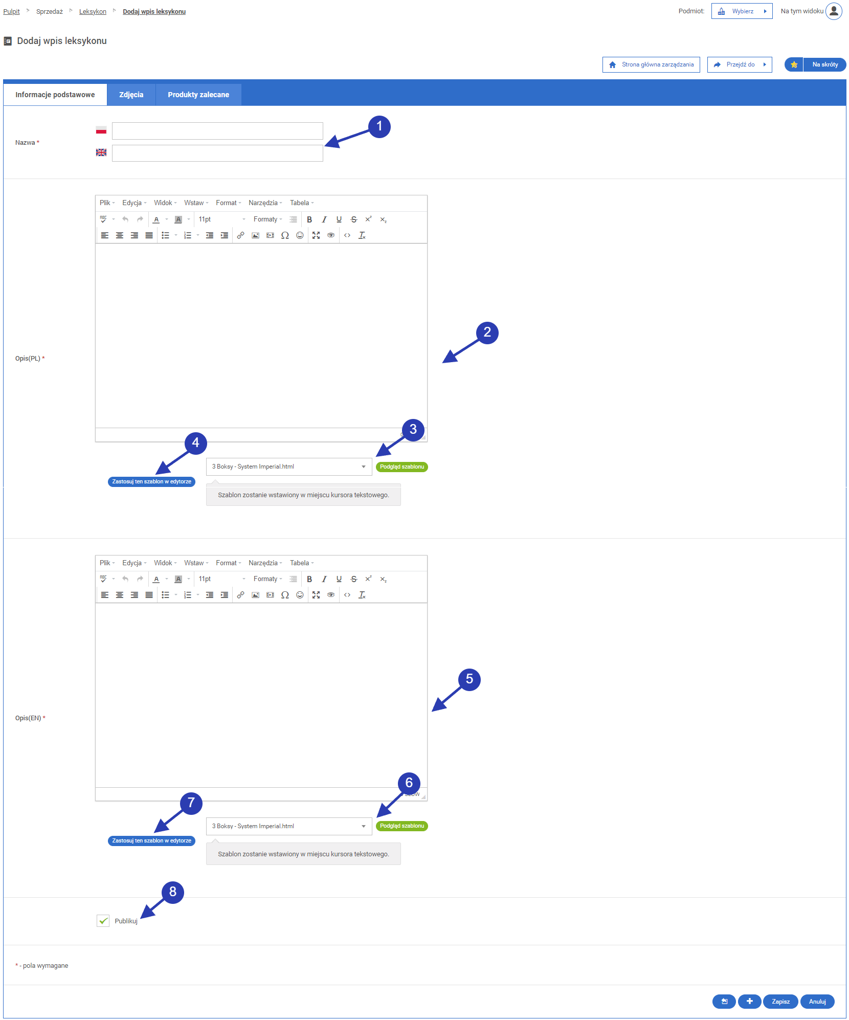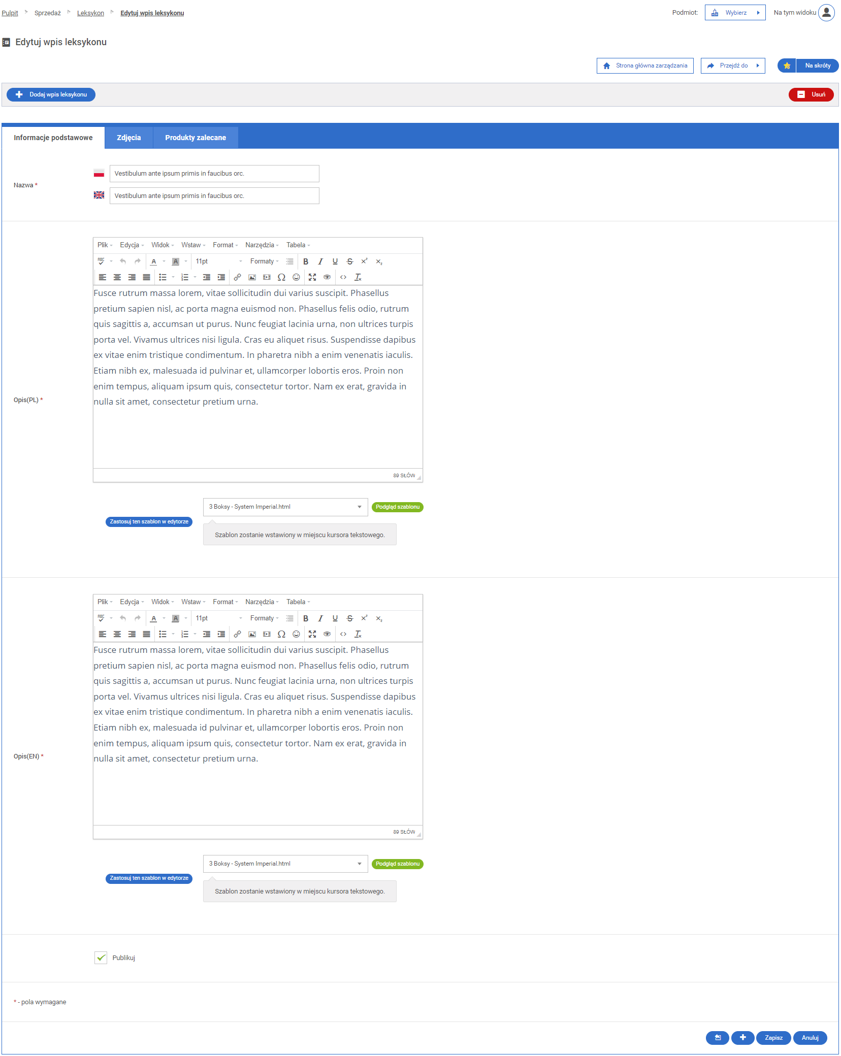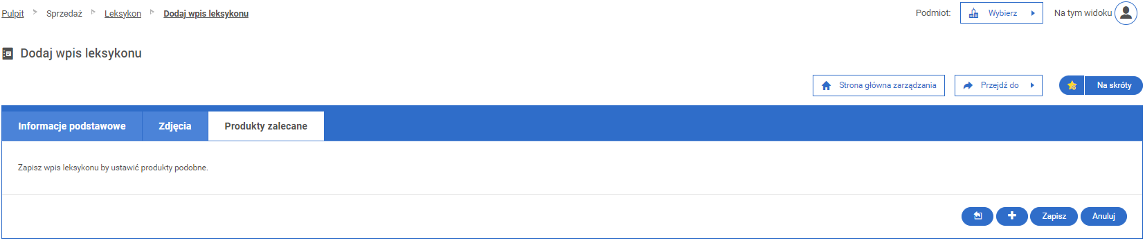 Podczas tworzenia nowego wpisu do leksykonu, w zakładce "Produkty zalecane" nie ma możliwości ustawienia produktów zalecanych. Użytkownik będzie miał dostęp do tego ustawienia w ekranie edycji wpisu do leksykonu.