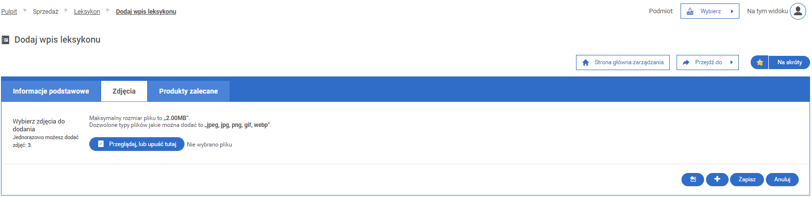 Podczas tworzenia nowego wpisu do leksykonu, w zakładce "Zdjęcia" istnieje możliwość dodania zdjęć do wpisu do leksykonu za pomocą przycisku.