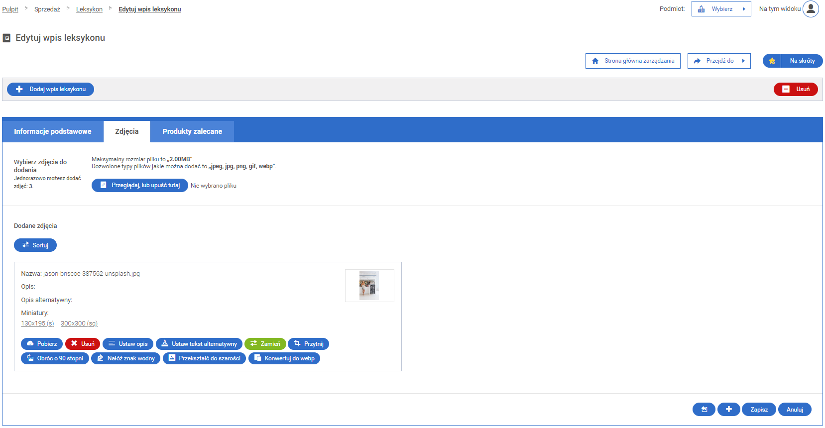 W oknie edycji wpisu leksykonu, w zakładce "Zdjęcia" użytkownik może pobierać zdjęcia, sortować, usuwać je, zamieniać na inne lub edytować w inny sposób. Może również dodawać nowe.