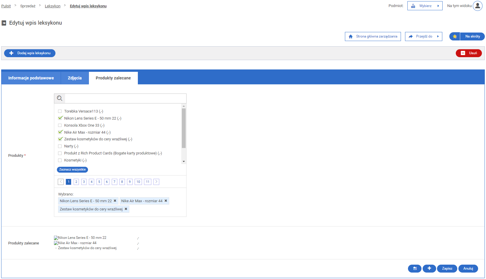 W oknie edycji wpisu leksykonu, w zakładce "Produkty zalecane" użytkownik może wybierać produkty z listy. Nazwy produktów zalecanych pojawią się poniżej od razu po ich wybraniu.
