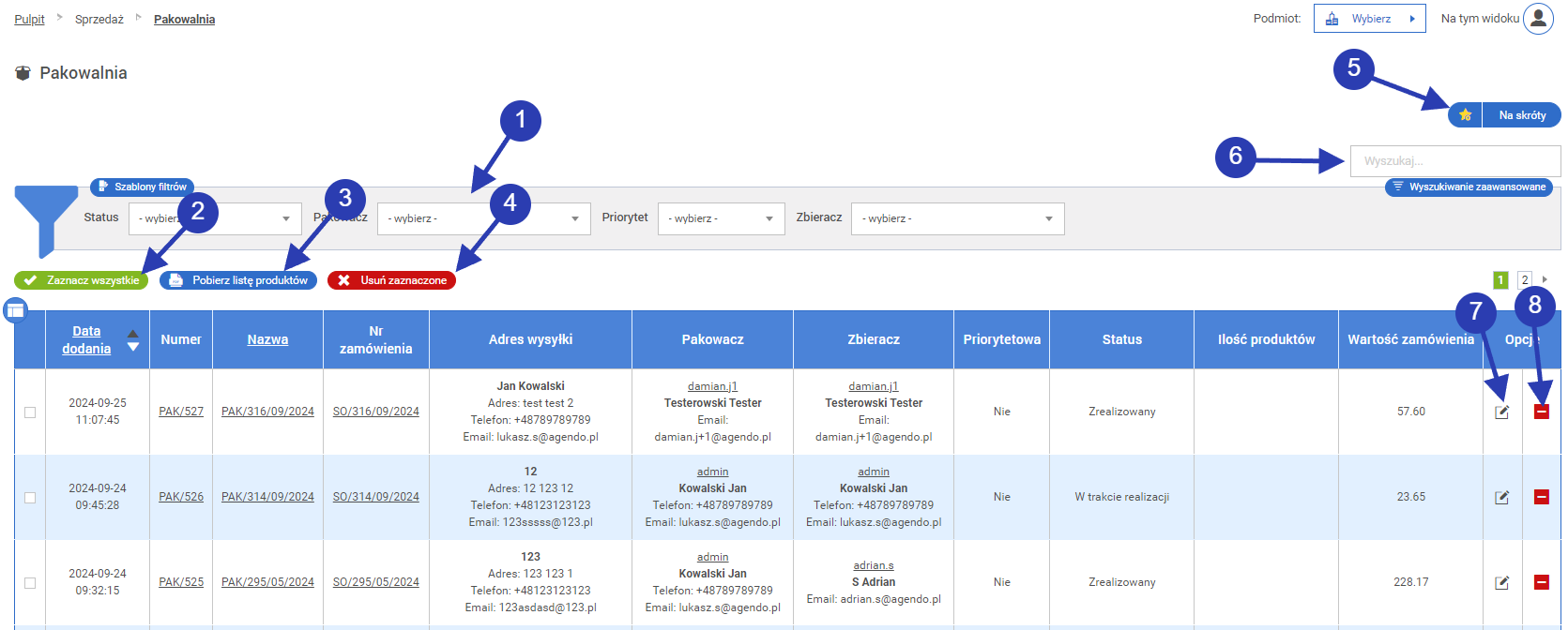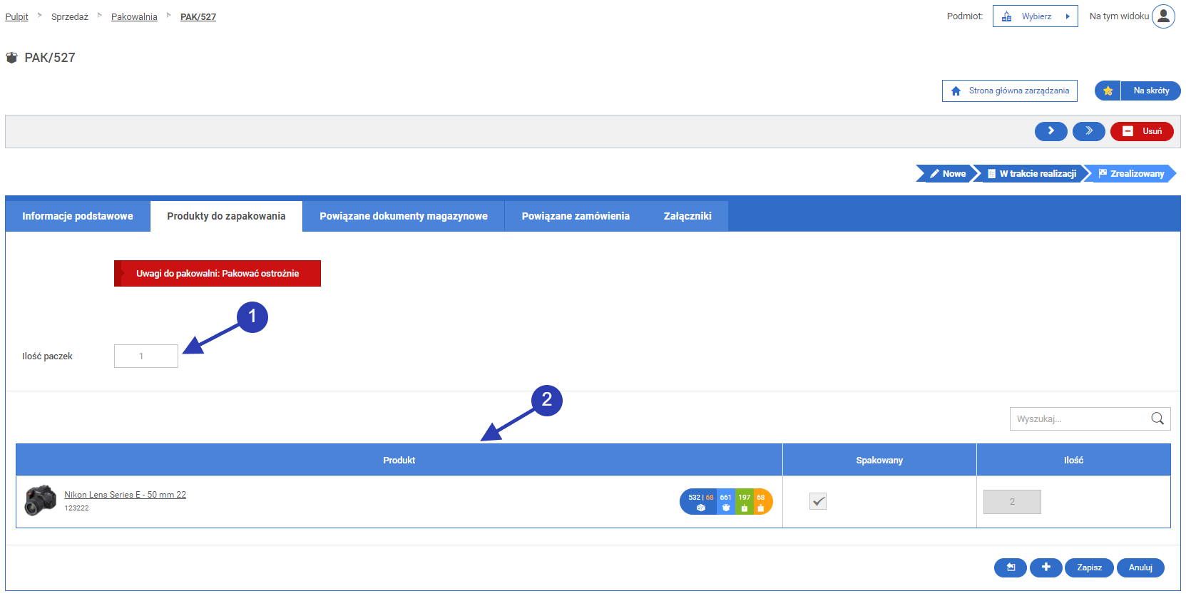 Tabela zawierająca informacje o produktach do zapakowania. Szare pola w tabeli mogą być niedostępne do edycji z powodu już zrealizowanego statusu pakowania.