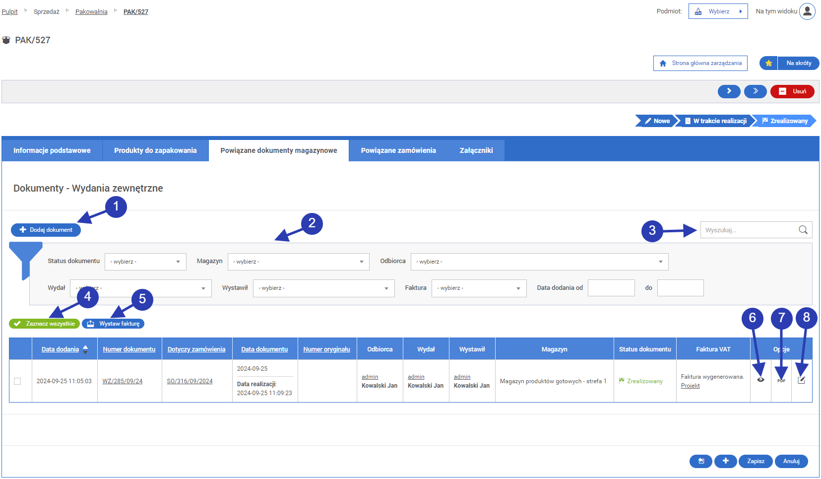 Ikona kierująca do ekranu edycji informacji o dokumencie i powiązanych produktach. Niektóre pola na ekranie mogą być niedostępne do edycji z powodu już zrealizowanego statusu dokumentu.