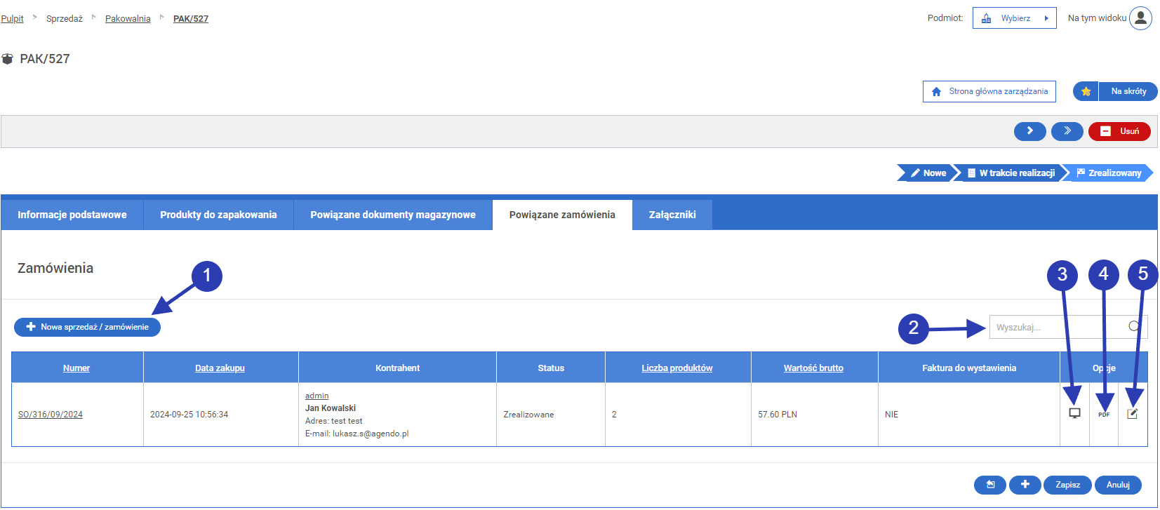 Ikona edycji przekierowująca do ekranu z informacjami na temat zamówienia. Niektóre pola mogą być niedostępne do edycji z powodu zrealizowanego statusu zamówienia.