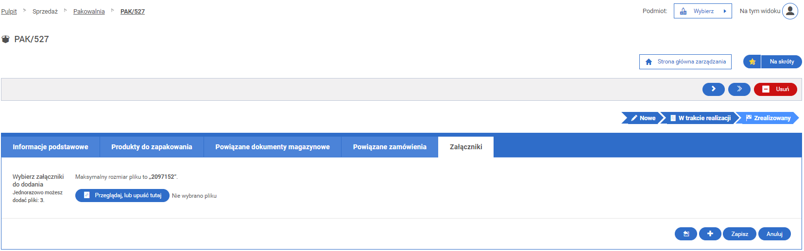 W oknie edycji operacji w pakowalni, w zakładce "Załączniki" istnieje możliwość dodania załączników powiązanych z operacją pakowania zamówienia.