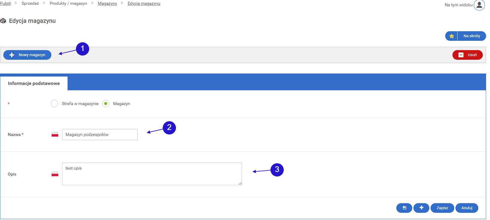 • 1.1.3. Ekran edycji istniejącego magazynu/edycji istniejącej strefy magazynowej