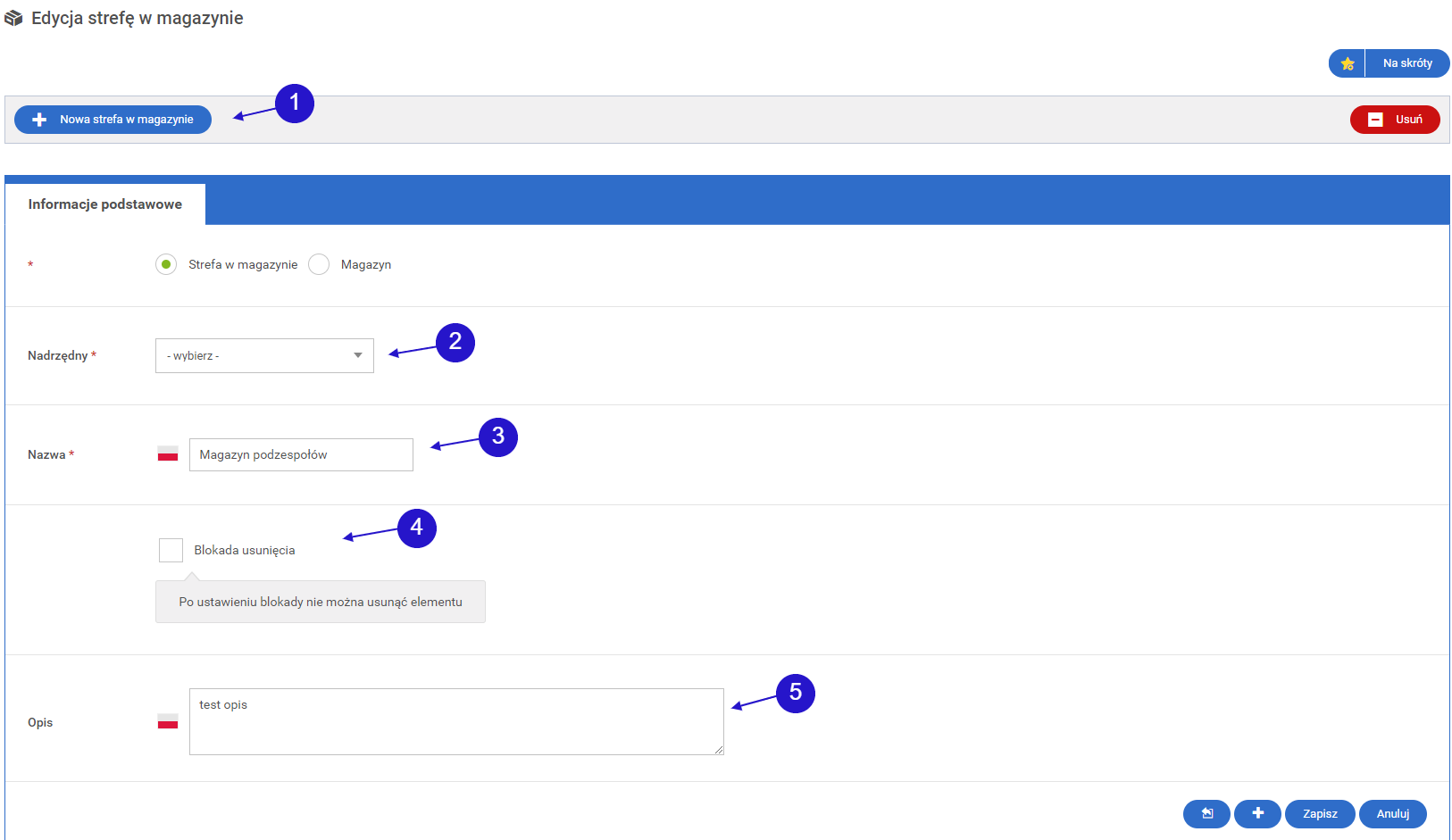 Pole na opis strefy magazynu. Domyślnie wypełniona aktualnymi danymi.