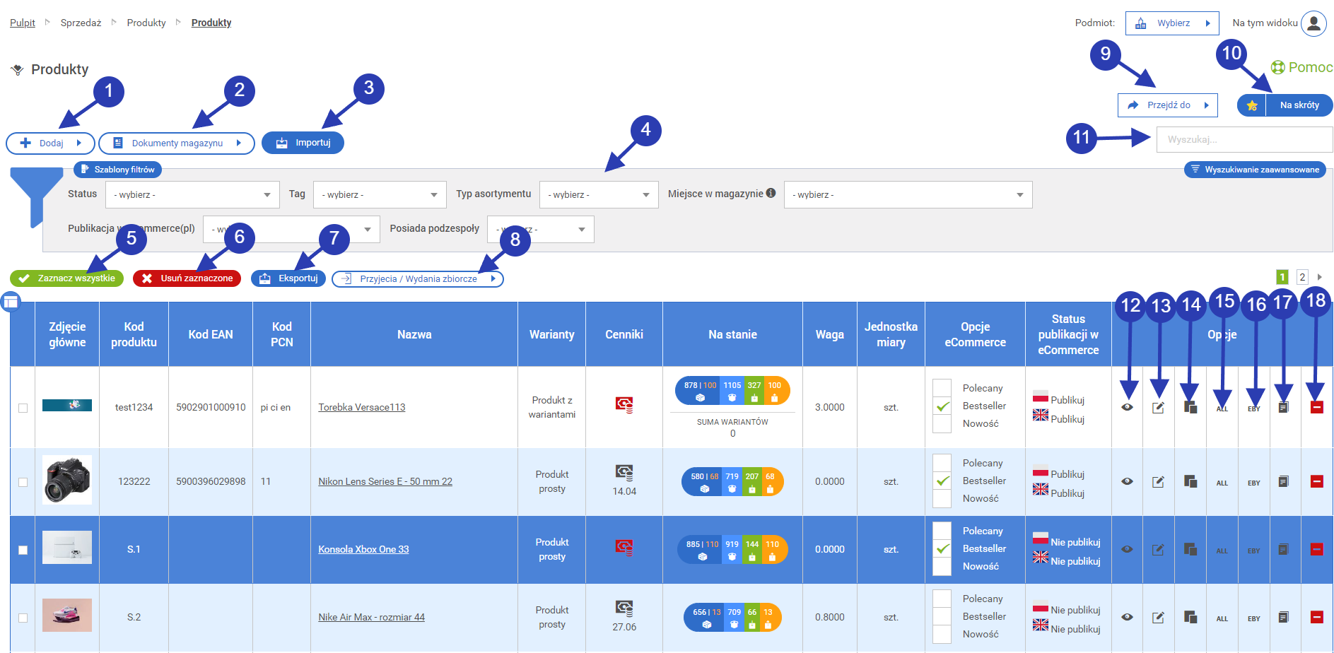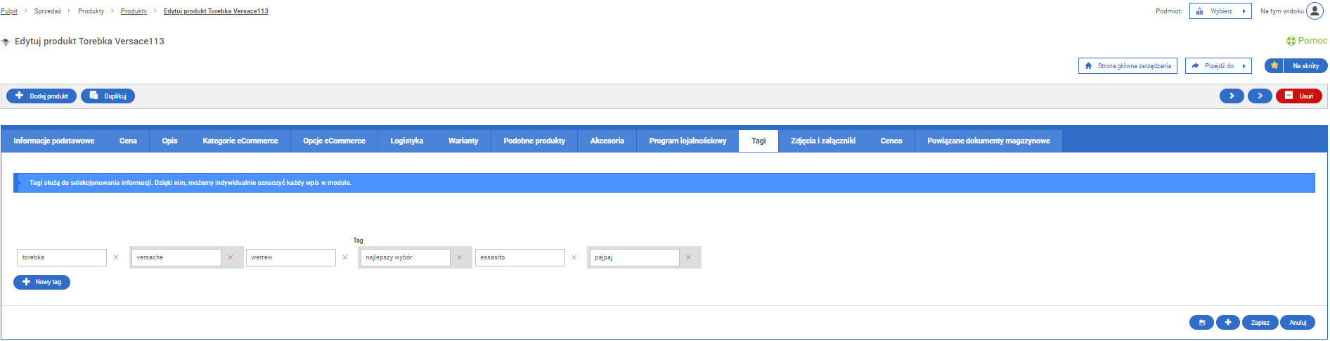 W oknie edycji produktu, w zakładce "Tagi" istnieje możliwość dodania i edytowania tagów do poszczególnych produktów.