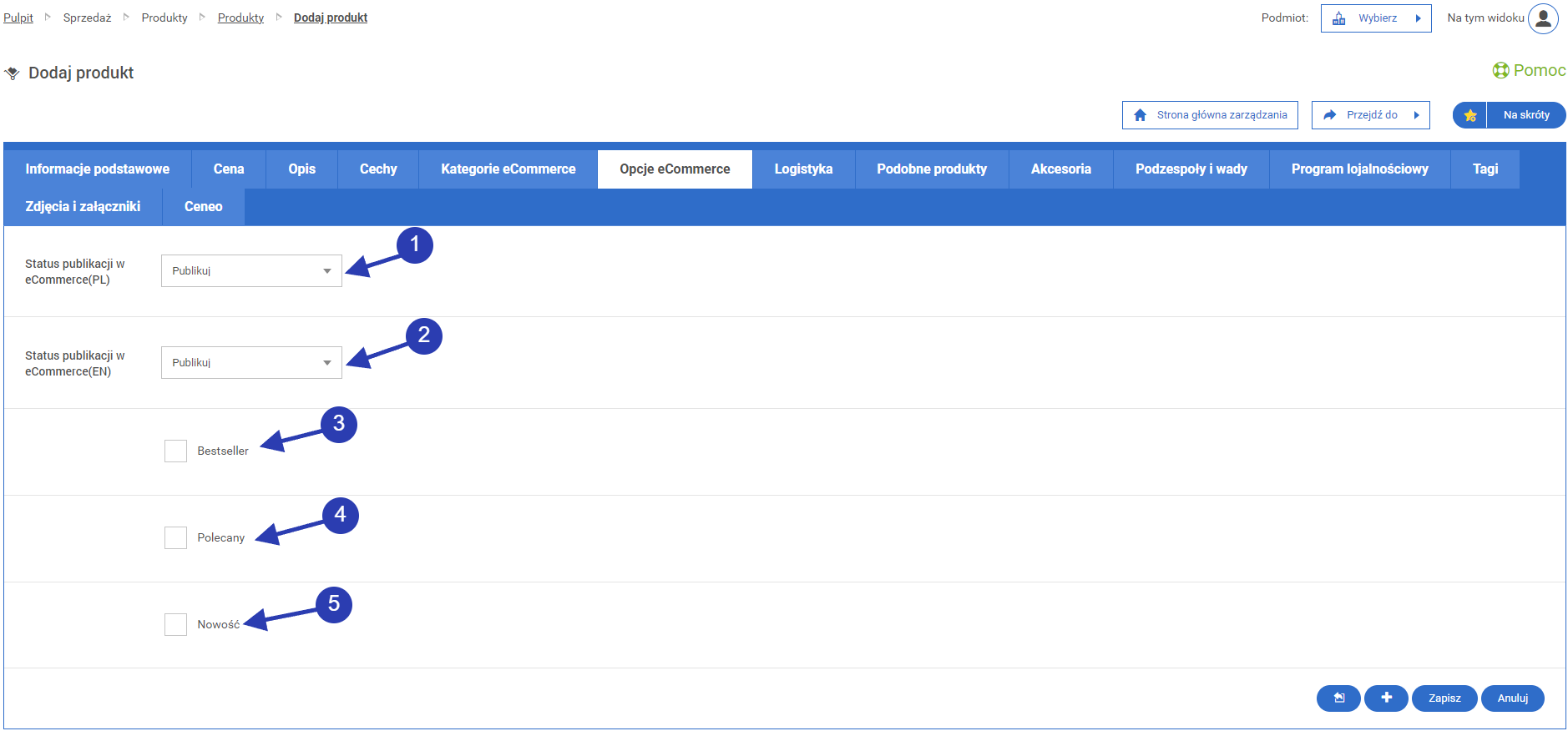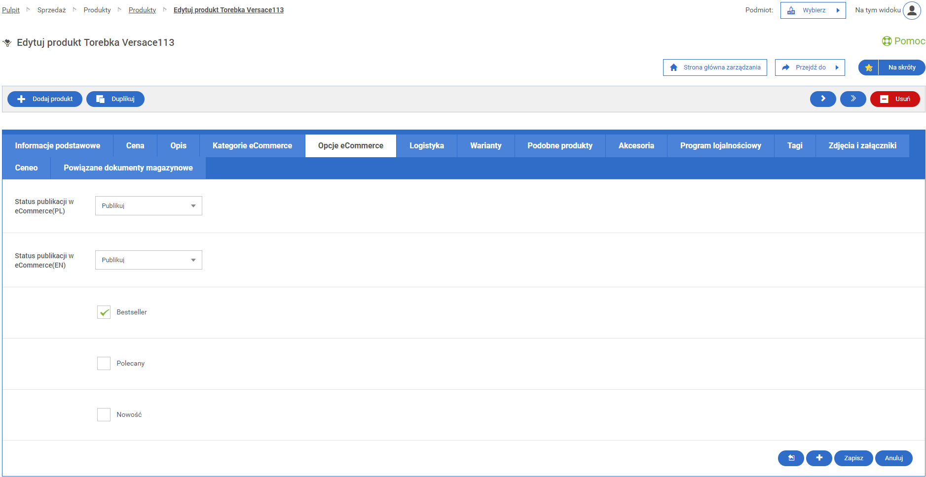 W oknie edycji produktu, w zakładce "Opcje eCommerce" zawarte są aktualne informacje o statusie publikacji produktu w sklepie internetowym. Okno edycji pozwala na modyfikację tych pól.