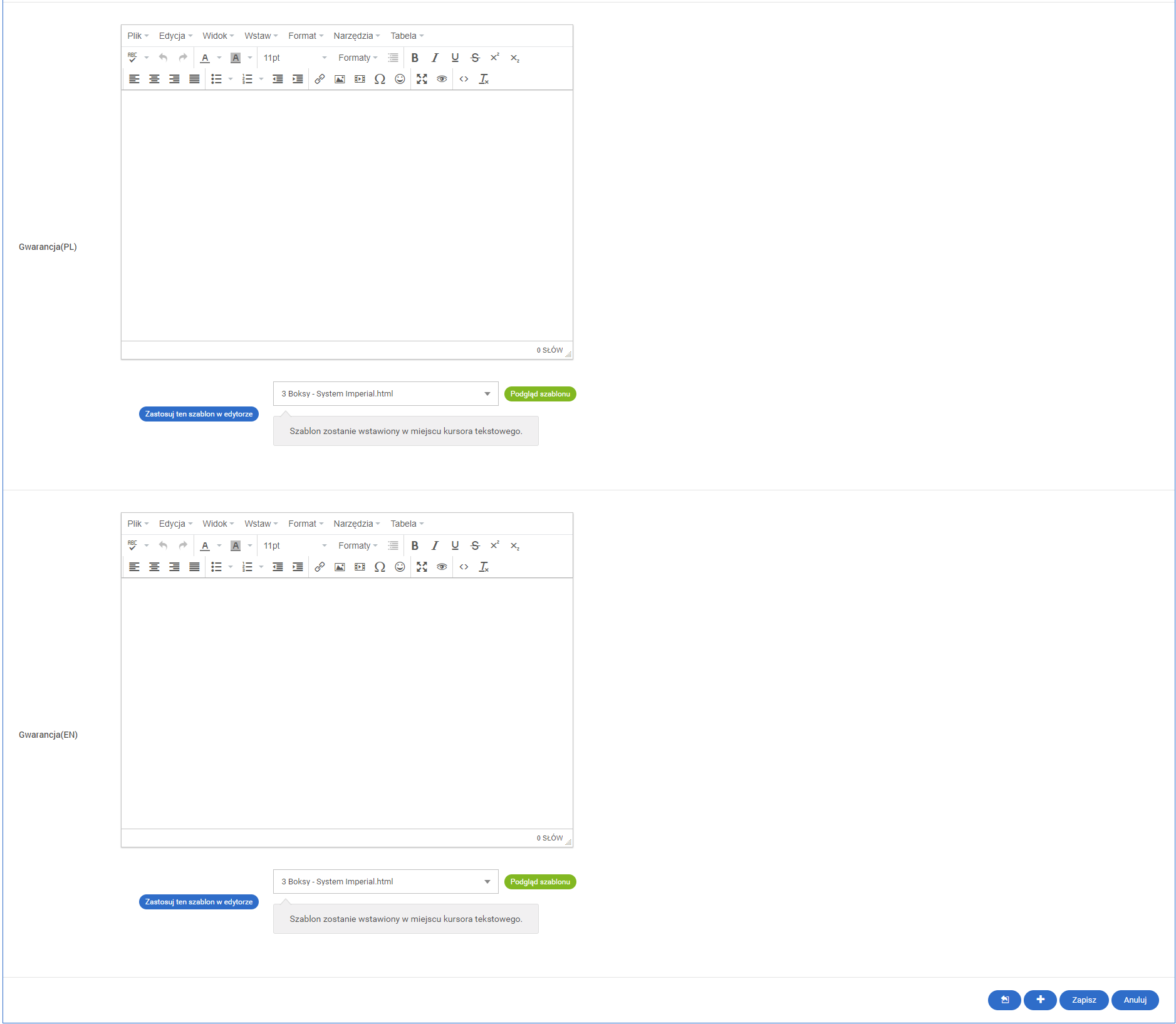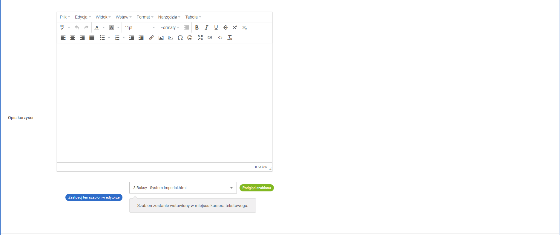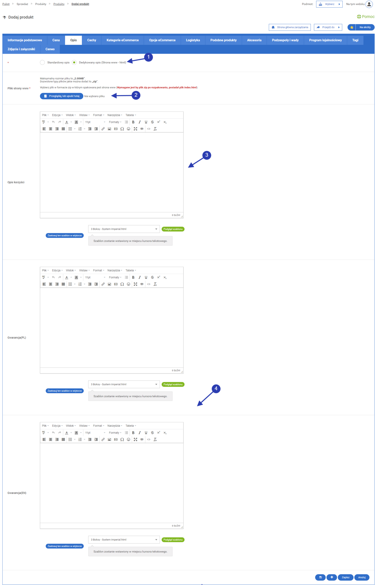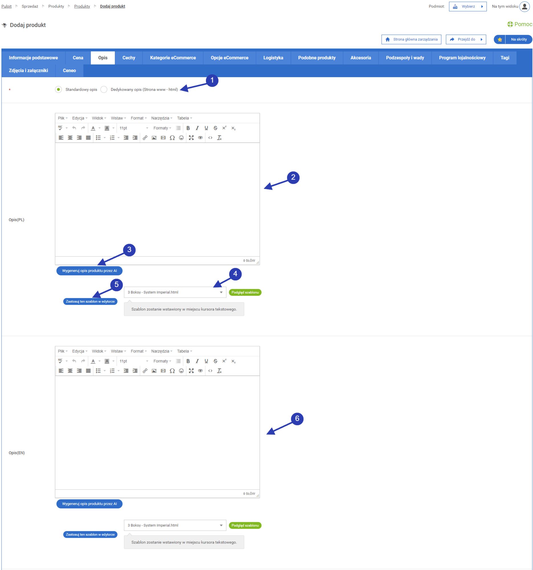 W oknie edycji produktu, w zakładce "Opis" zawarty jest aktualny opis produktu. Użytkownik może modyfikować zawartość opisu.