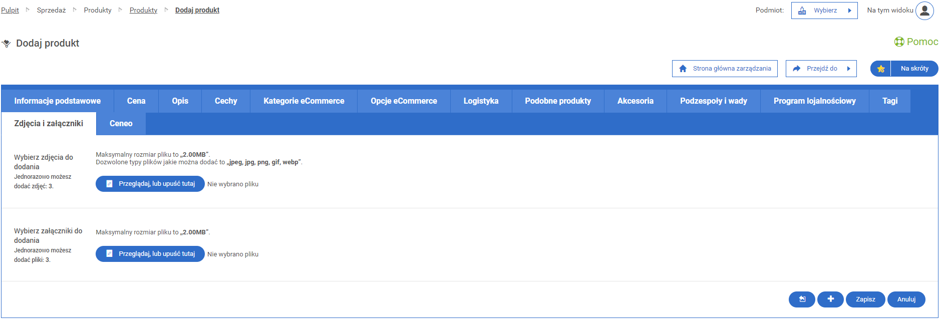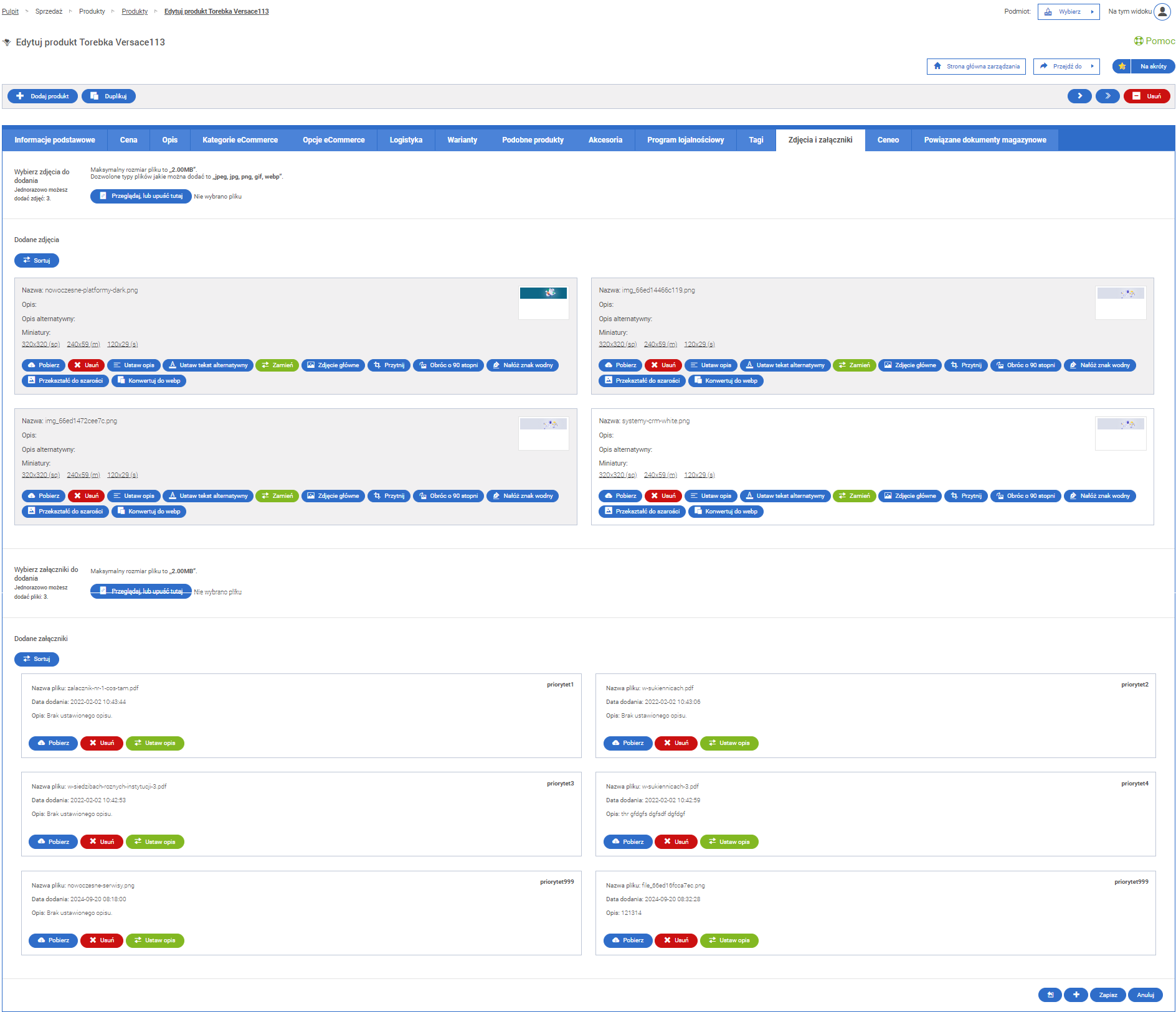 W oknie edycji produktu, w zakładce "Zdjęcia i załączniki" wyświetlone są aktualne zdjęcia oraz załączniki dodane do produktu. Użytkownik ma możliwość pobrania ich, usunięcia lub zastąpienia innymi oraz wiele innych opcji.