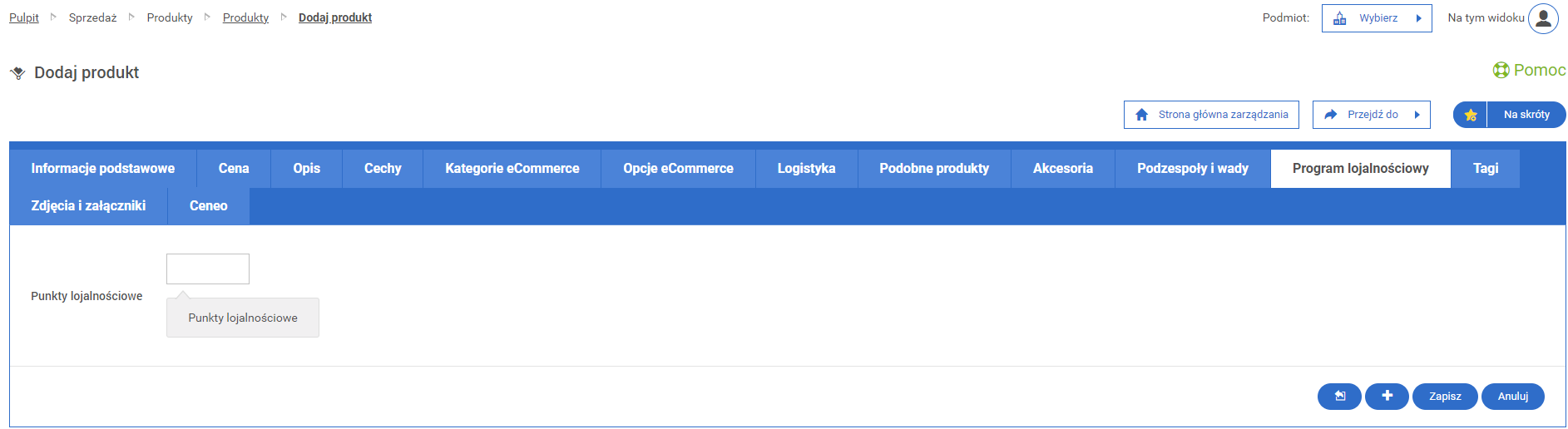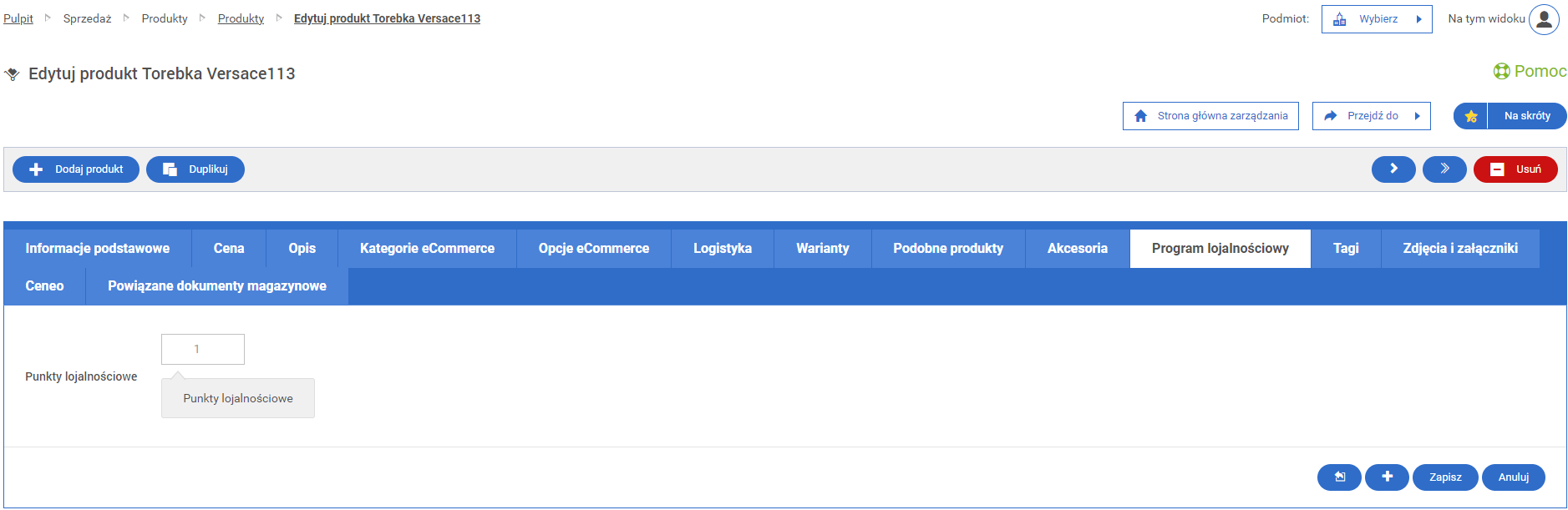 W oknie edycji produktu, w zakładce "Program lojalnościowy" zawarte są aktualne informacje o punktach lojalnościowych. Okno edycji pozwala na modyfikację pola.