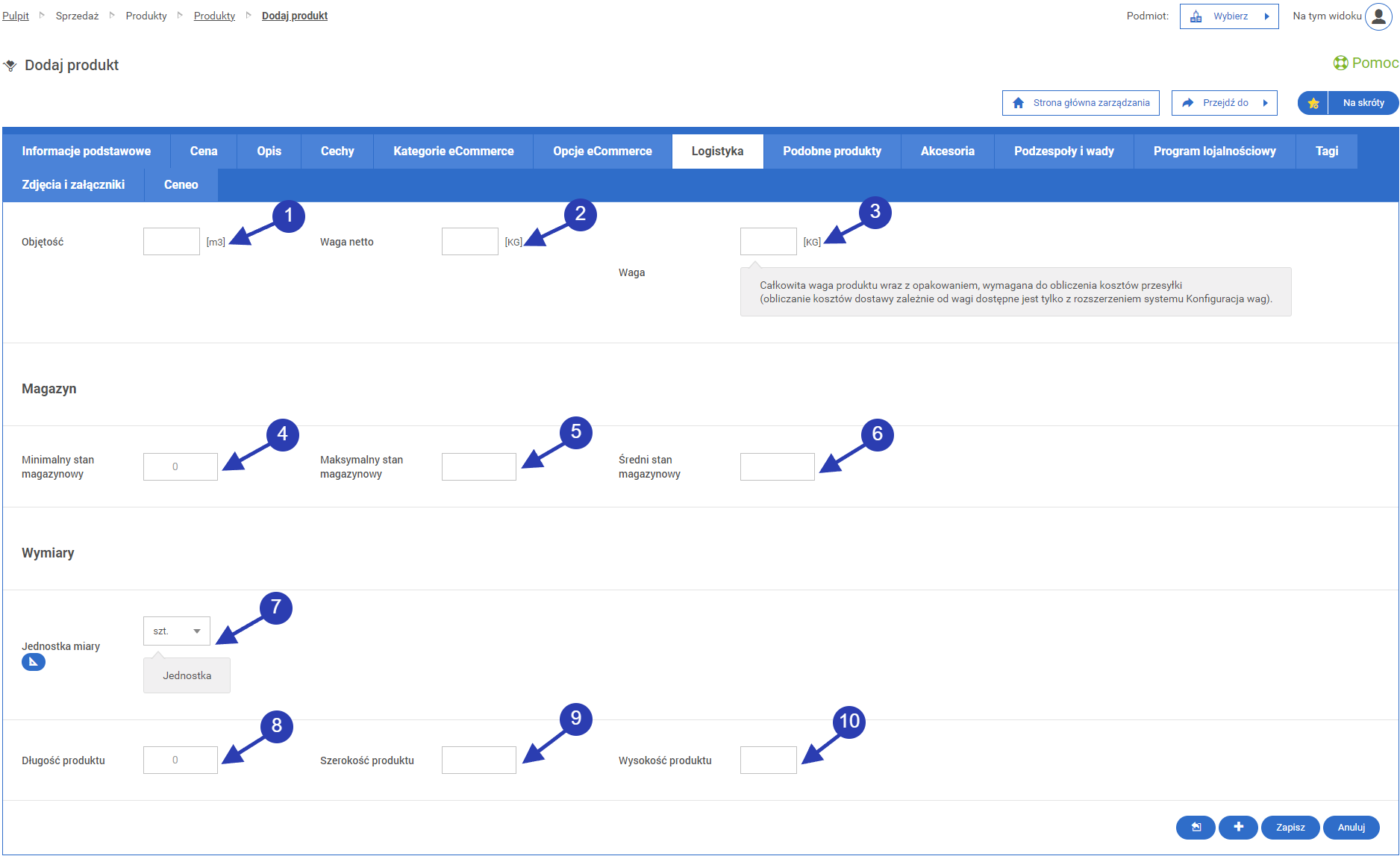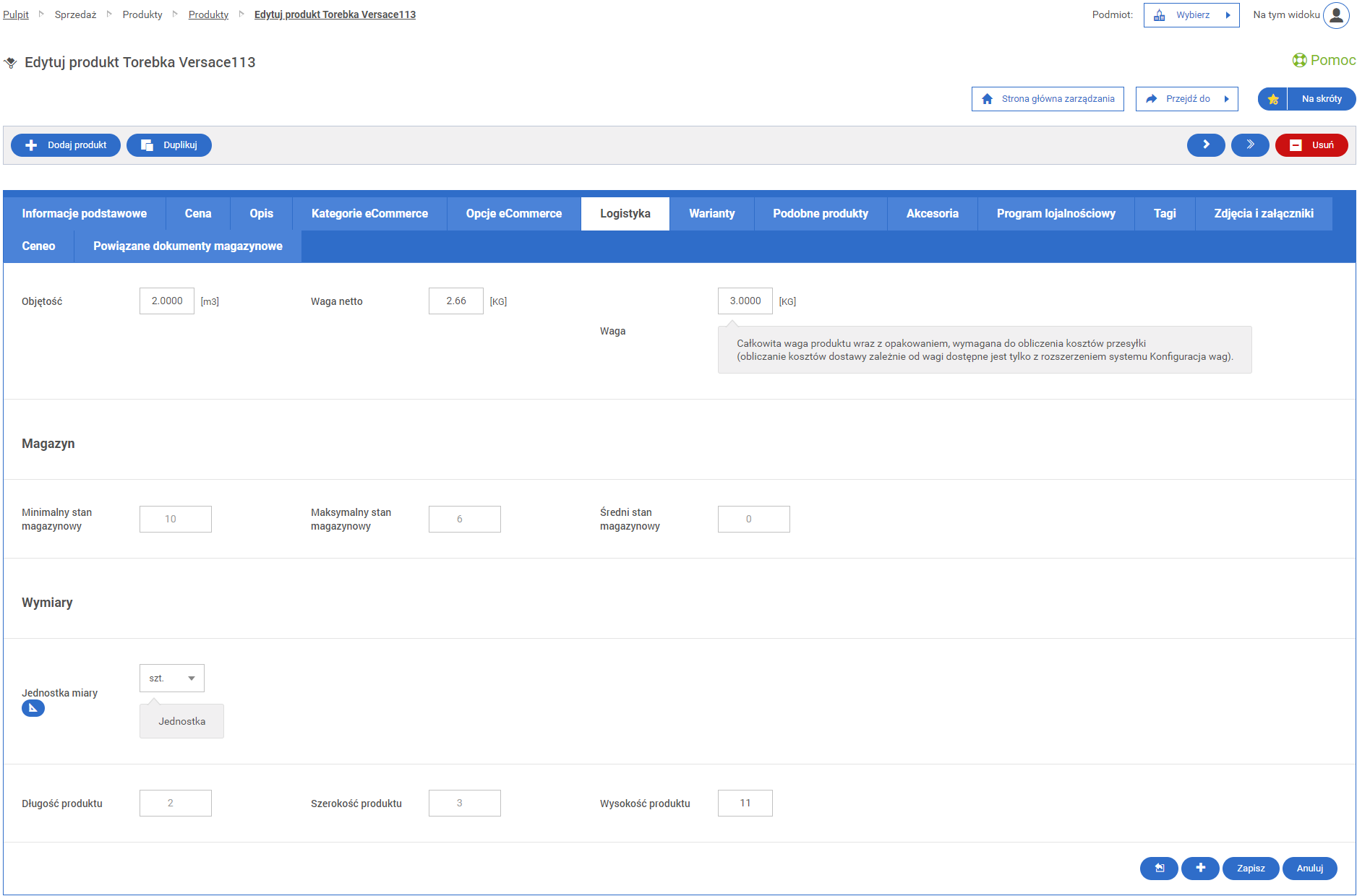 W oknie edycji produktu, w zakładce "Logistyka" zawarte są aktualne informacje o wadze, objętości i jednostce miary produktu. Okno edycji pozwala na modyfikację tych pól.