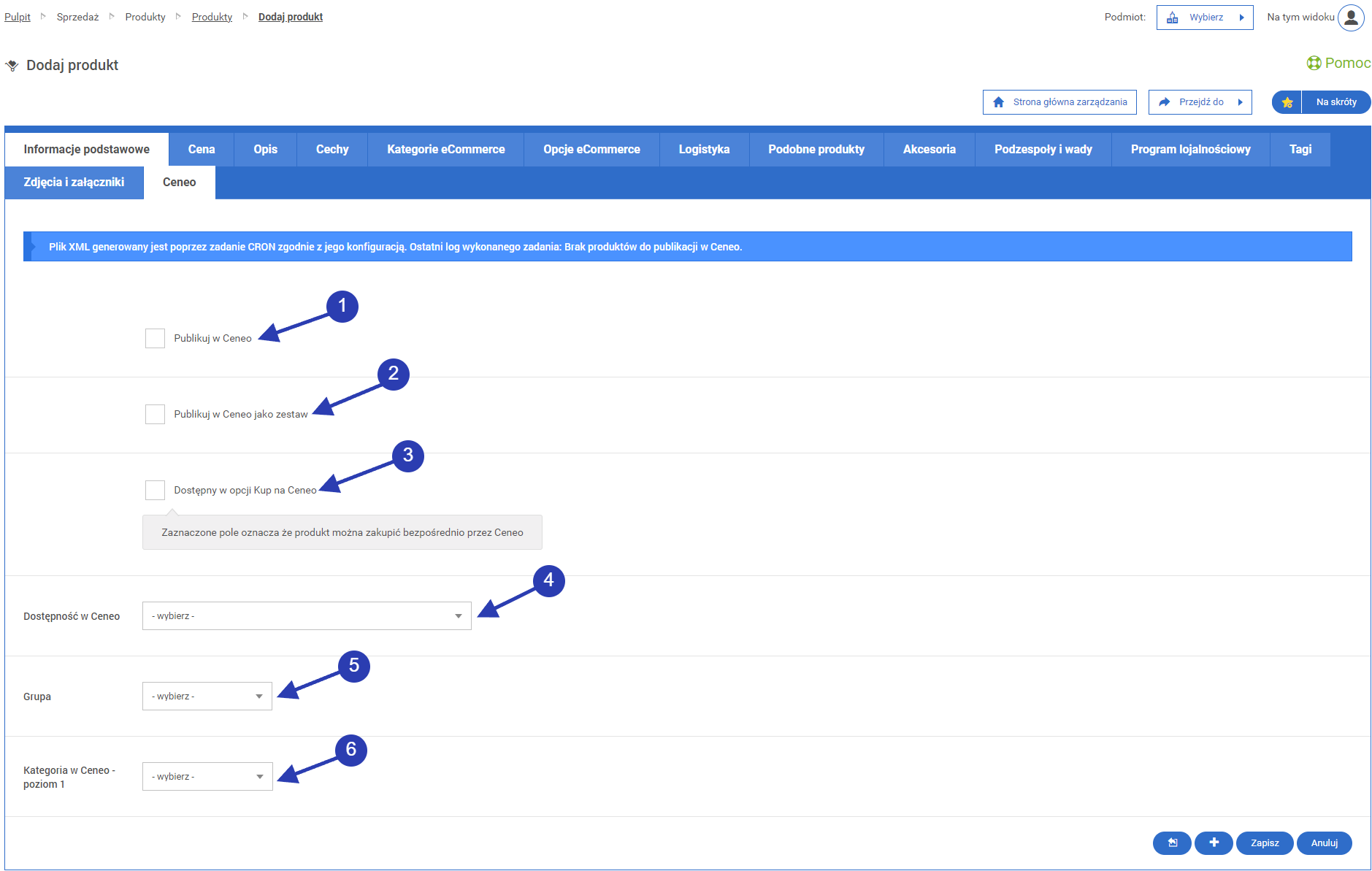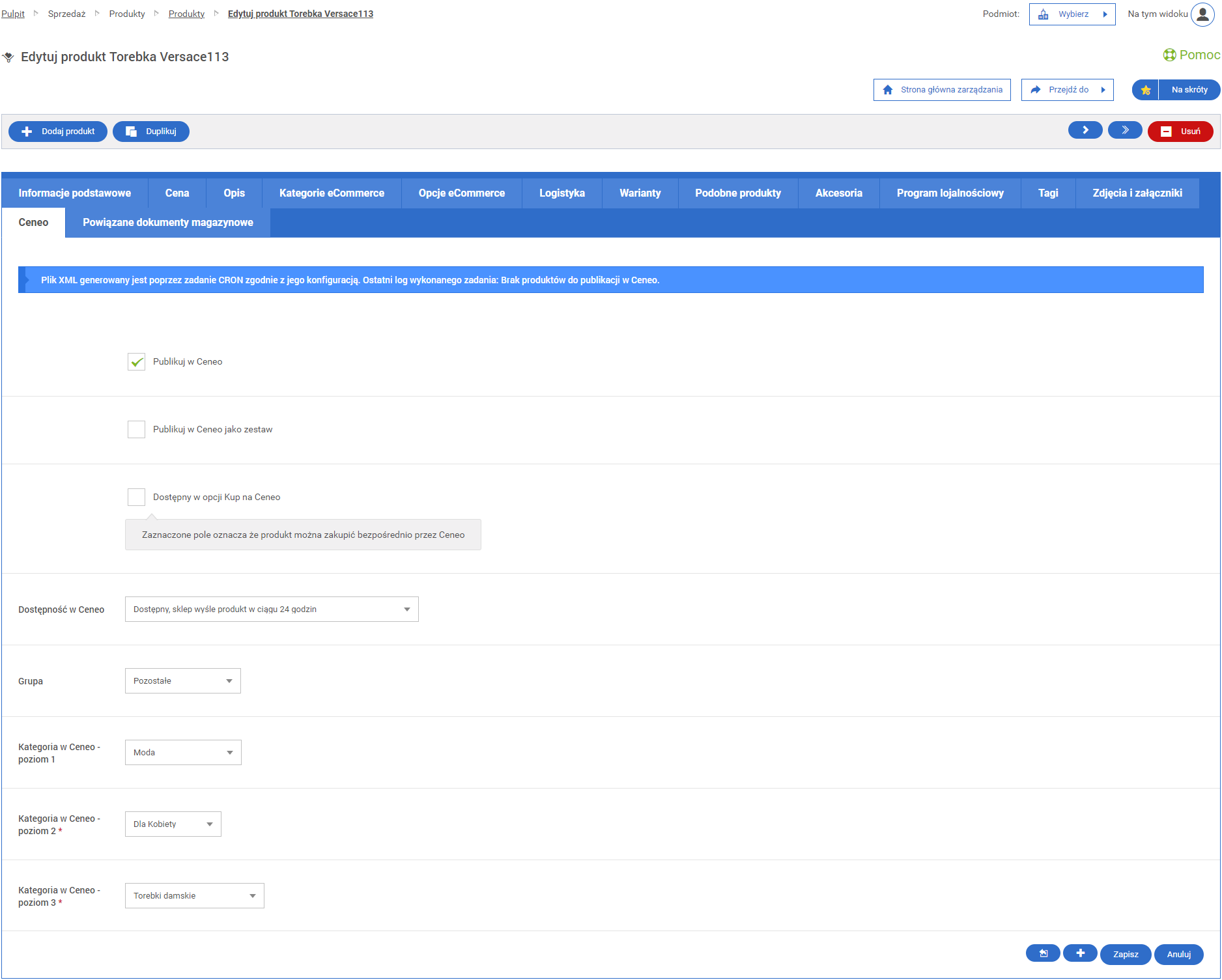 W oknie edycji produktu, w zakładce "Ceneo" zawarte są aktualne informacje o statusie publikacji produktu na stronie serwisu Ceneo. Okno edycji pozwala na modyfikację tych pól.