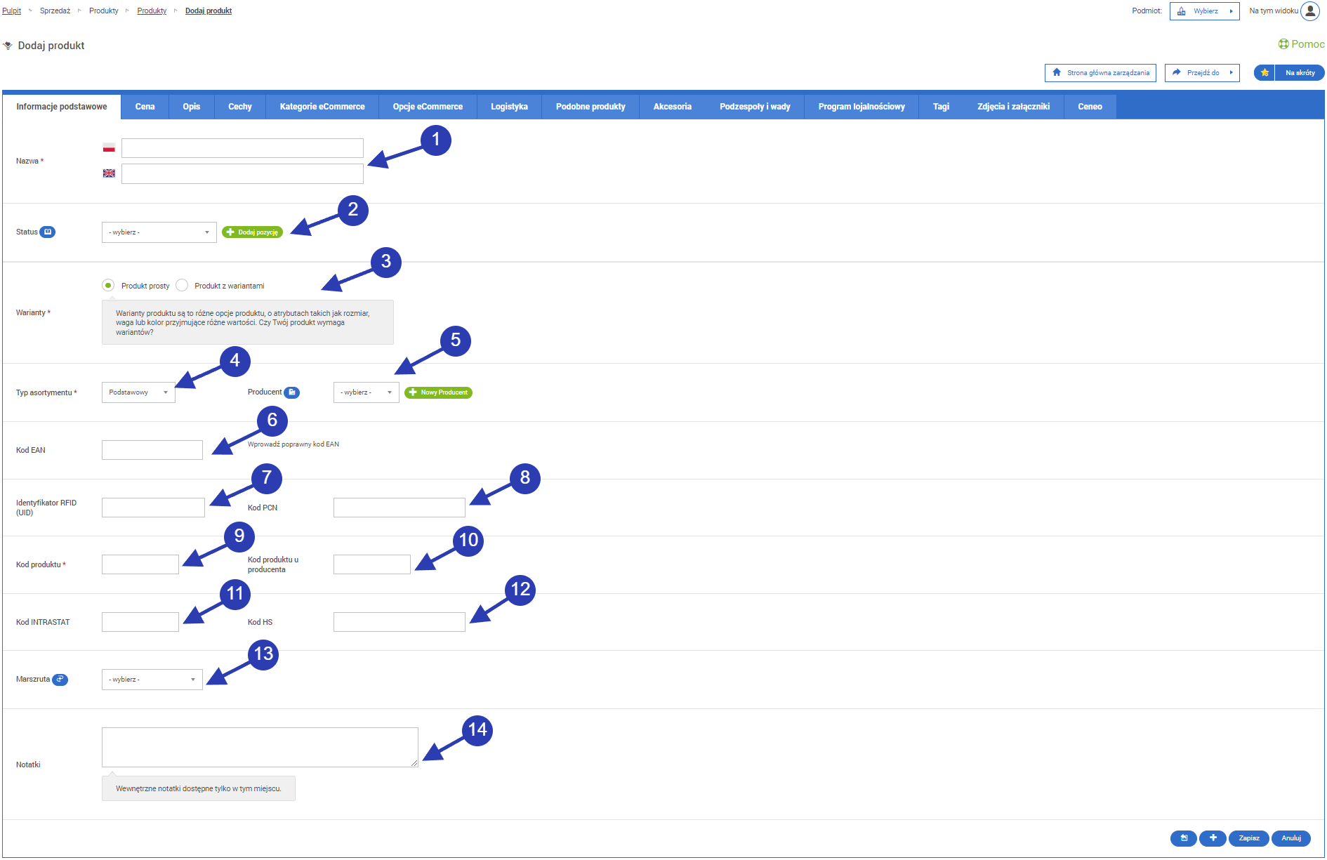 W oknie edycji produktu, w zakładce "Informacje podstawowe", pola należy wypełnić zgodnie z zaleceniami zawartymi w podrozdziale "Tworzenie produktu". Domyślnie pola wypełnione są aktualnymi danymi.