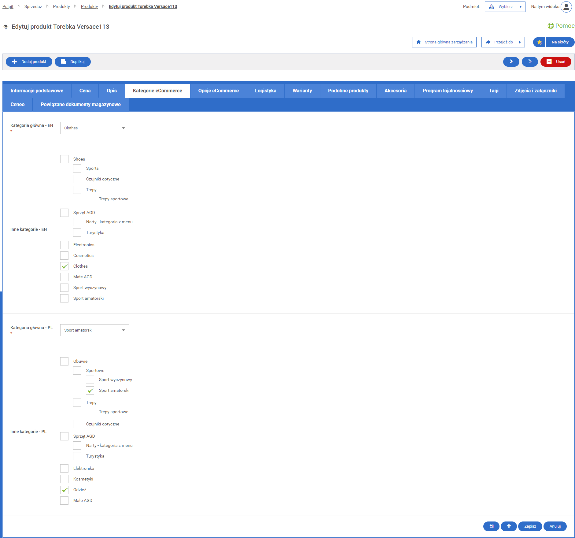 W oknie edycji produktu, w zakładce "Kategorie eCommerce" zawarte są aktualne informacje o kategoriach produktu. Okno edycji pozwala na modyfikację tych pól.