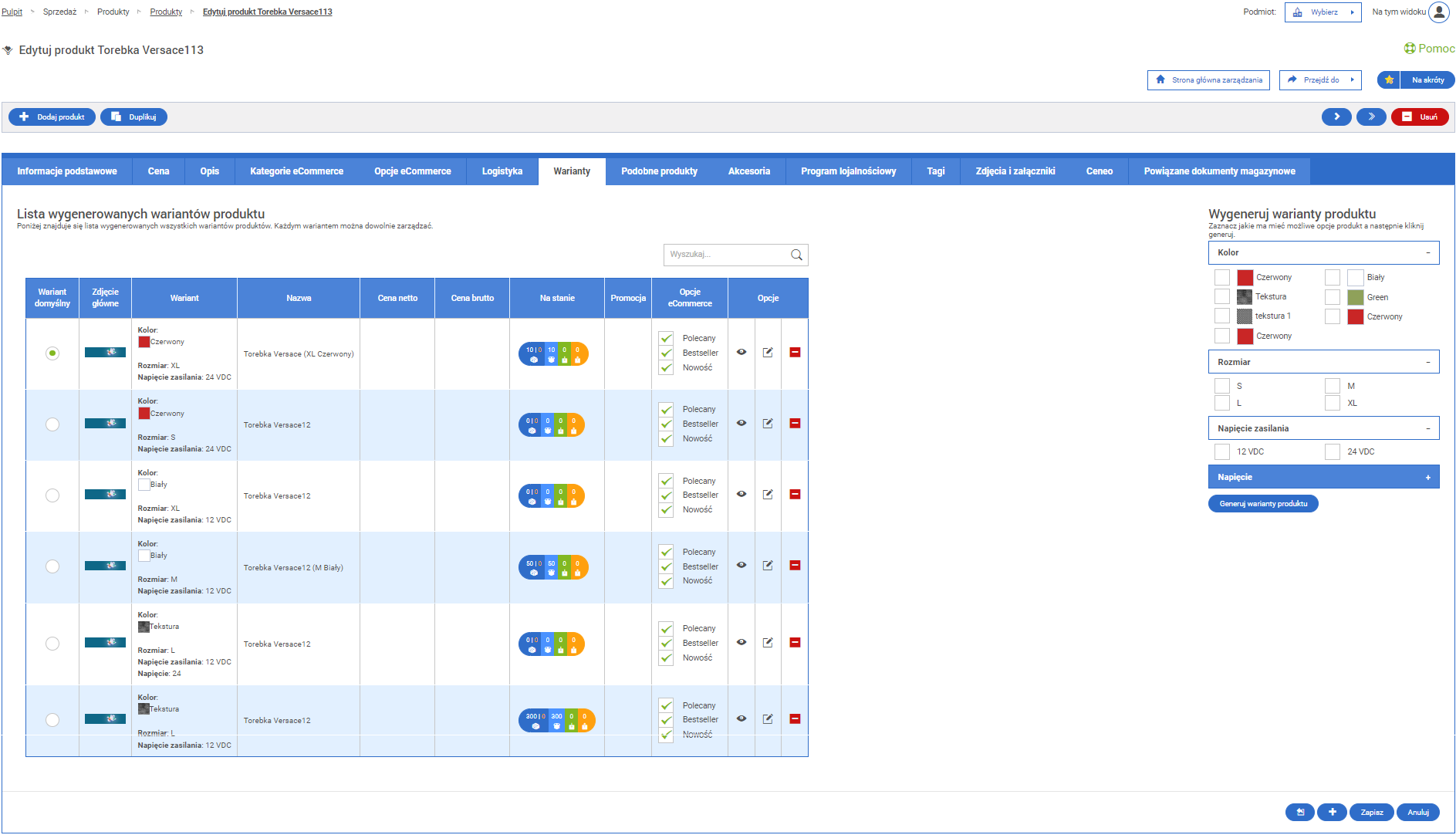 W zależności od utworzonego produktu, w oknie edycji może pojawić się zakładka Warianty lub Podzespoły i wady. W oknie edycji produktu, w zakładce "Warianty" istnieje możliwość generowania wariantów produktu. Dostepne opcje są do wyboru z list rozwijanych po prawej stronie wraz z przyciskiem generującym warianty. Po lewej stronie znajduje się lista wygenerowanych wariantów produktu wraz z możliwością ich podglądu, edytowania i usunięcia.