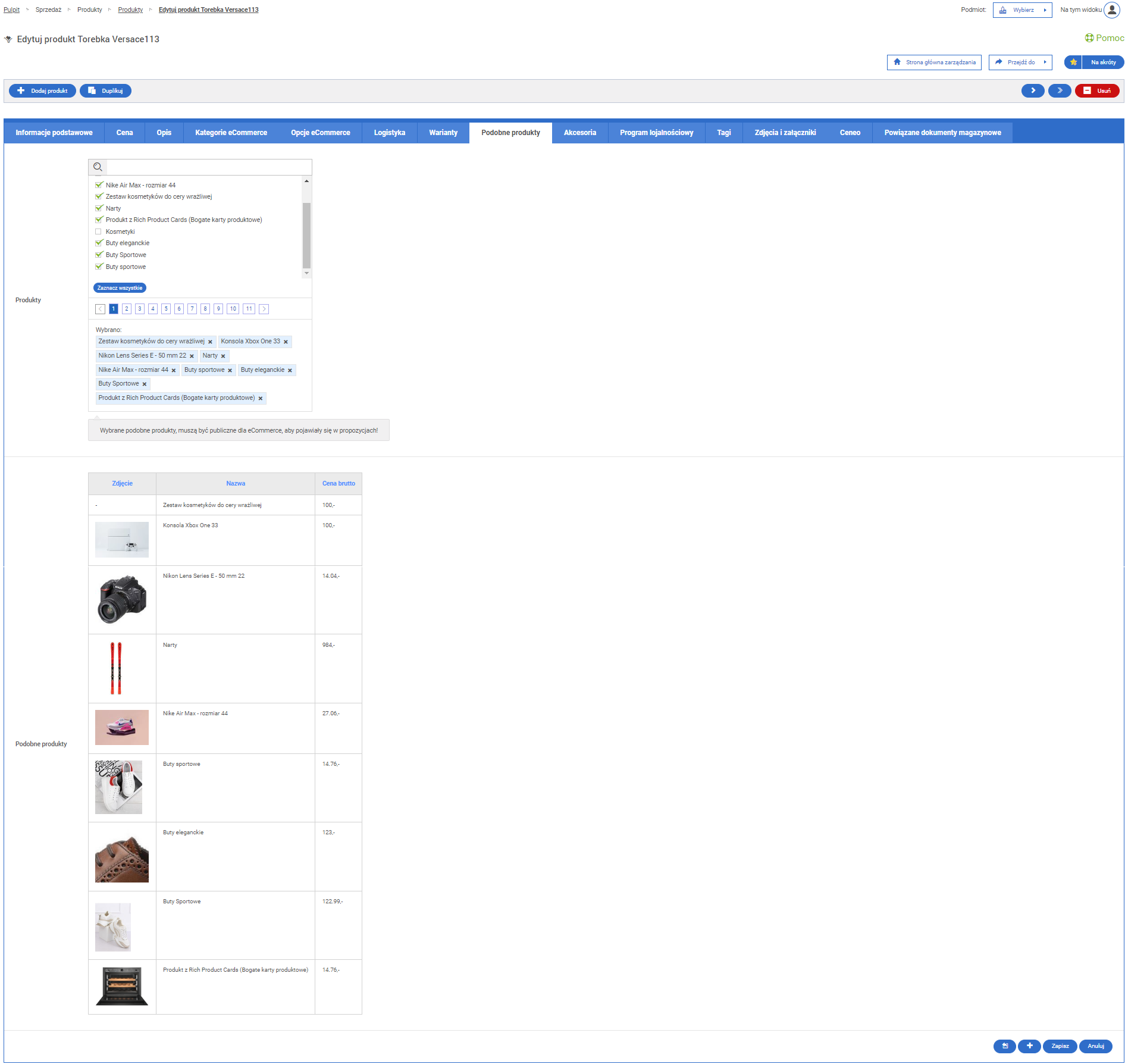 W oknie edycji produktu, w zakładce "Podobne produkty" istnieje możliwość dodawania podobnych produktów do edytowanego. Po zaznaczeniu na liście wyboru produktów pojawi się poniżej lista podobnych produktów wraz z ich zdjęciami i ceną brutto.