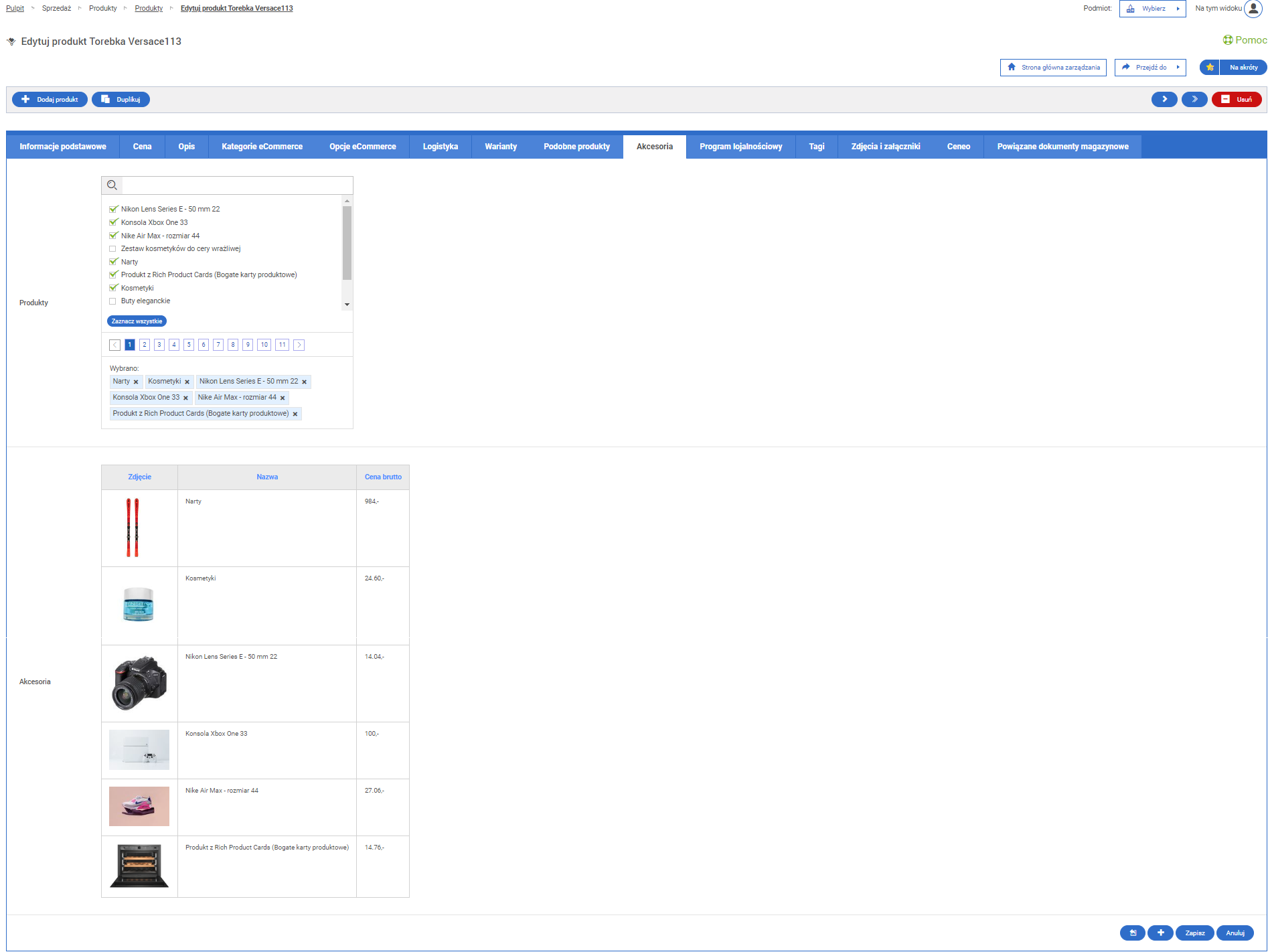 W oknie edycji produktu, w zakładce "Akcesoria" istnieje możliwość dodawania akcesoriów do edytowanego produktu. Po zaznaczeniu na liście wyboru poszczególnych produktów pojawi się poniżej lista akcesoriów wraz z ich zdjęciami i ceną brutto.