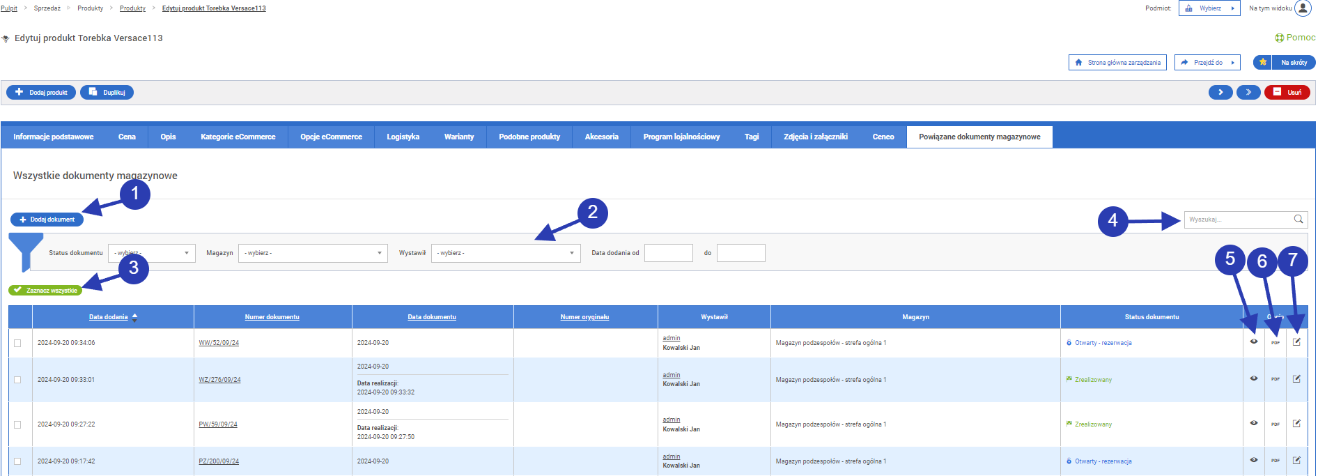Po wybraniu edycji istniejącego produktu użytkownik otrzymuje możliwość skorzystania z nowego okna "Powiązane dokumenty magazynowe". Dokumenty zebrane są w tabeli Wszystkie dokumenty magazynowe oraz podzielone na tabele z przyjęciami zewnętrznymi, wydaniami zewnętrznymi, wydaniami zewnętrznymi oraz przesunięciami międzymagazynowymi..
