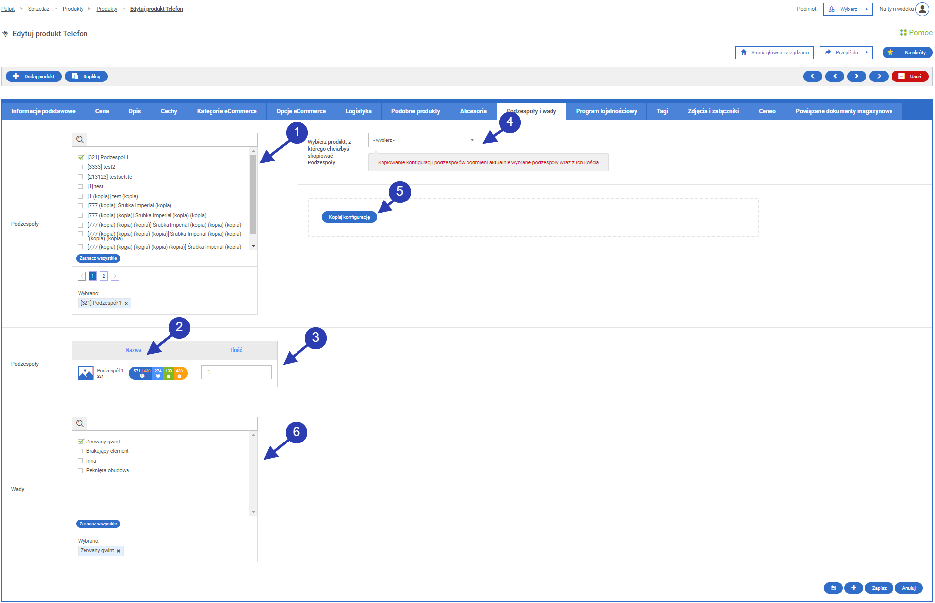 W zależności od utworzonego produktu, w oknie edycji może pojawić się zakładka Warianty lub Podzespoły i wady.