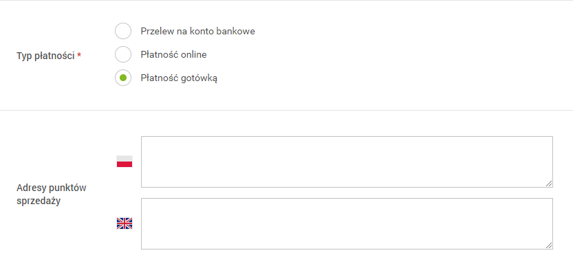Po wyborze typu płatności "Płatność gotówką" do ekranu głównego dołączone zostają pola z nazwą: "Adresy punktów sprzedaży", w których należy podać adresy punktów sprzedaży, które zostaną wyświetlone użytkownikowi po wyborze tego typu płatności.