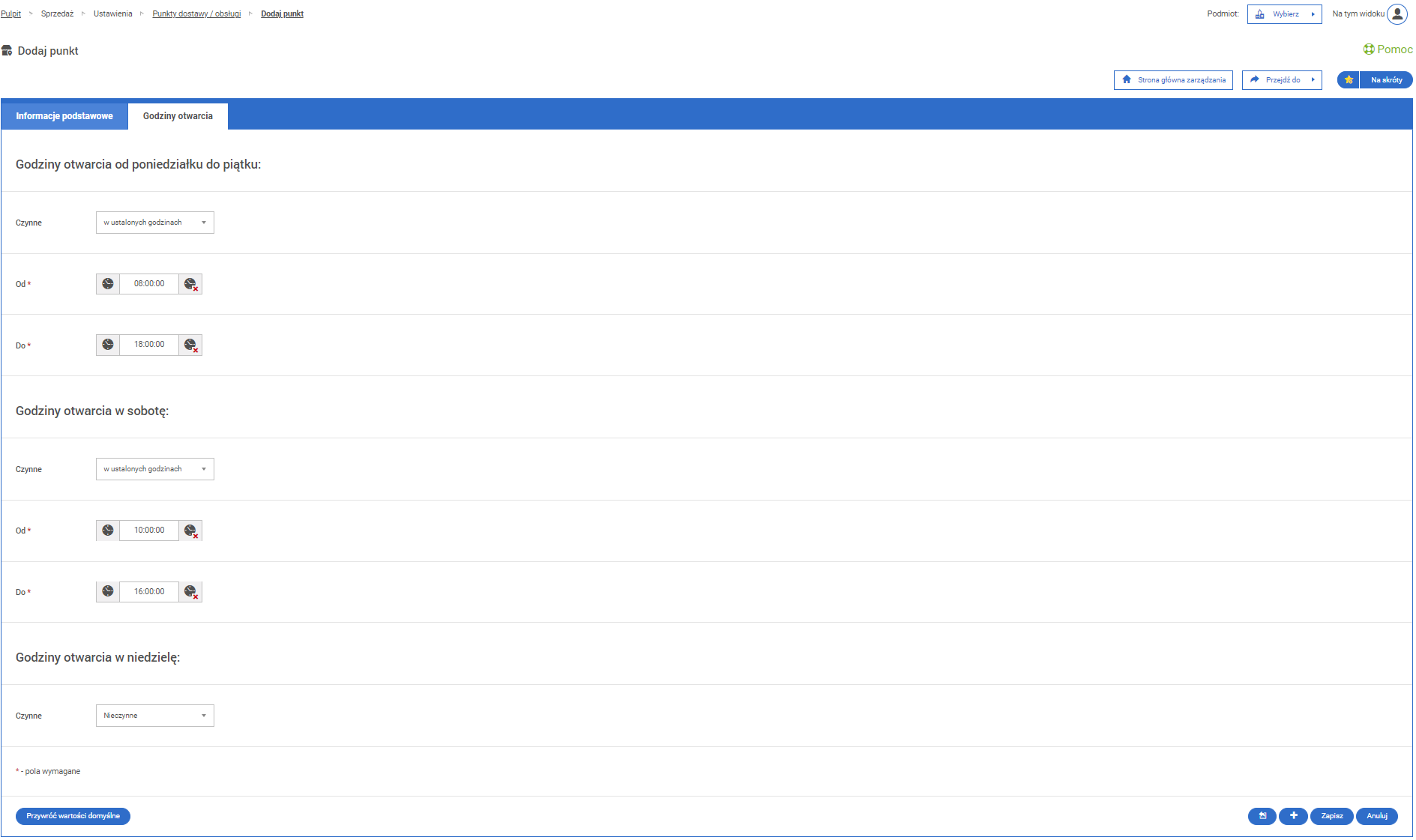 Zakładka "Godziny otwarcia" domyślnie posiada wypełnione pola aktualnymi danymi. Pola należy wypełnić zgodnie z zaleceniami zawartym w podrozdziale "Ekran tworzenia nowego punktu dostawy / obsługi".