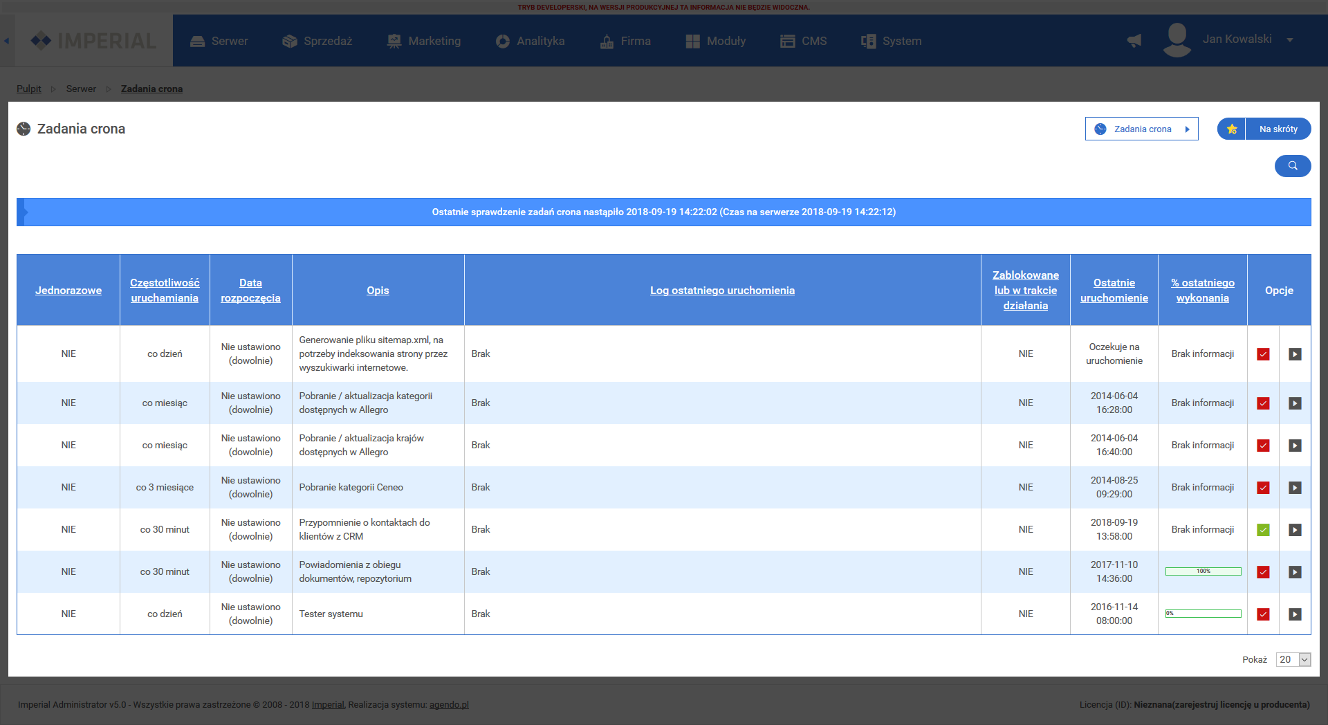 Moduł zadania CRON'a wyświetla listę akcji, które wykonywane są co określony czas. Pozwala, to zautomatyzować pewne funkcjonalności systemu wyręczając użytkownika w działaniu. Zadania dodane są podczas etapu wdrażania serwisu oraz generowane w momencie wykonania przez użytkownika pewnych akcji. Mogą być one powtarzane co jakiś okres czasu, usuwane po wykonaniu lub blokowane, kiedy w wyniku ich działania pojawią się błędy.