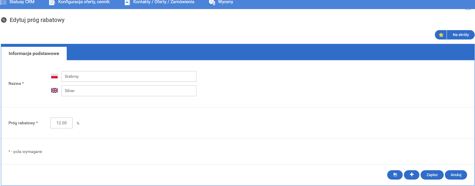 Pole na nazwę progu rabatowego dla wersji językowej polskiej i angielskiej.