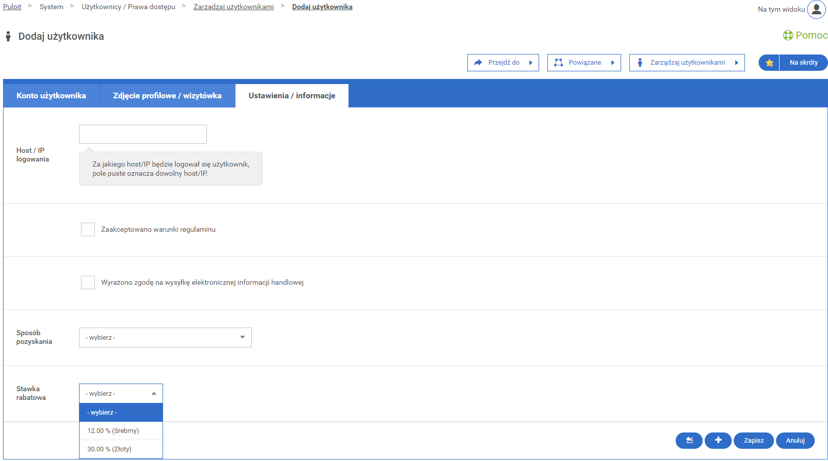 W module System -> Użytkownicy / prawa dostępu -> Zarządzaj użytkownikami przy tworzeniu nowego użytkownika istnieje możliwość przydzielenia użytkownikowi progu rabatowego. Dzięki tej opcji użytkownik będzie miał naliczony indywidualny rabat w systemie.